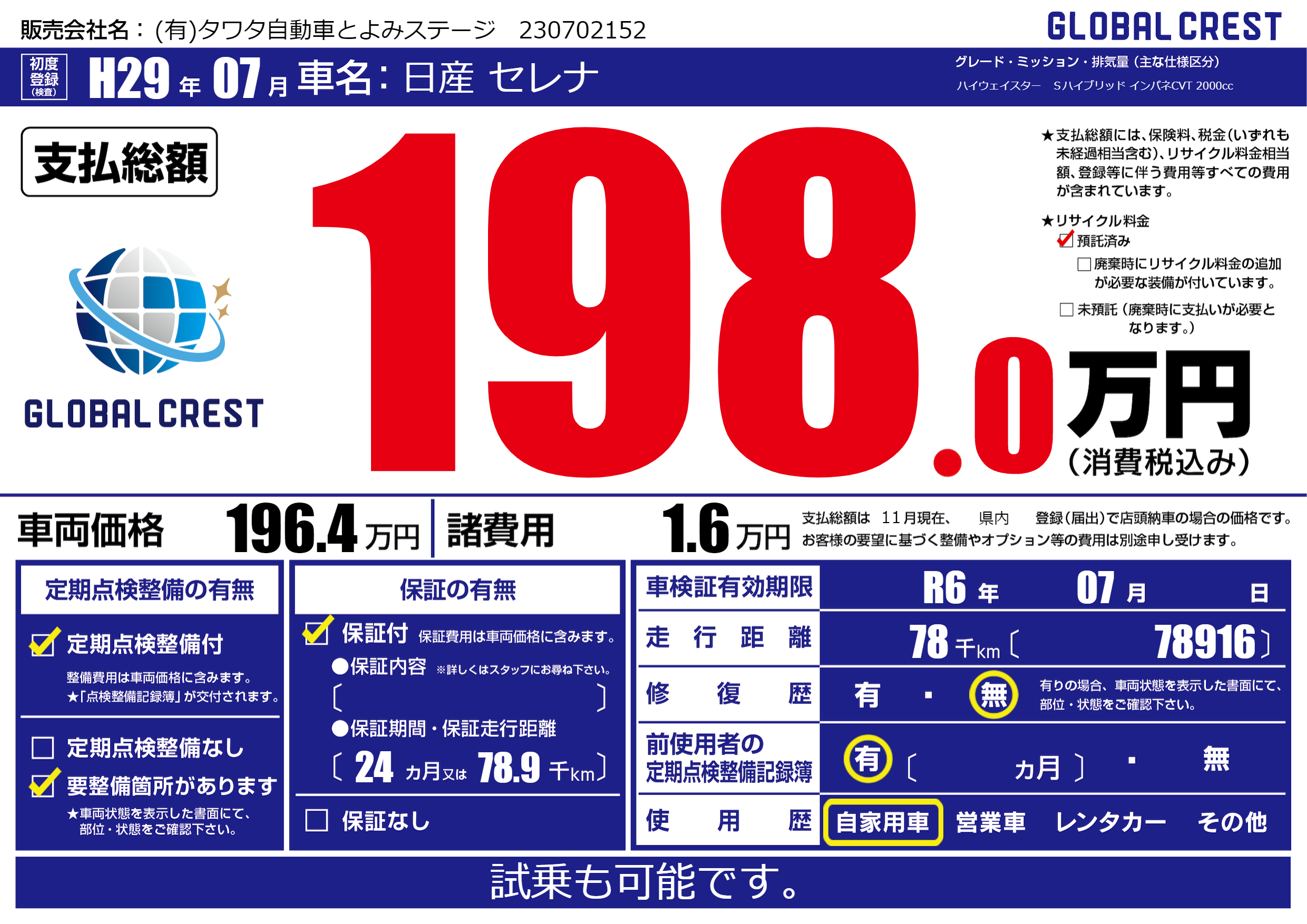 | 車検制限 | R6年 07月 - 日 | ||