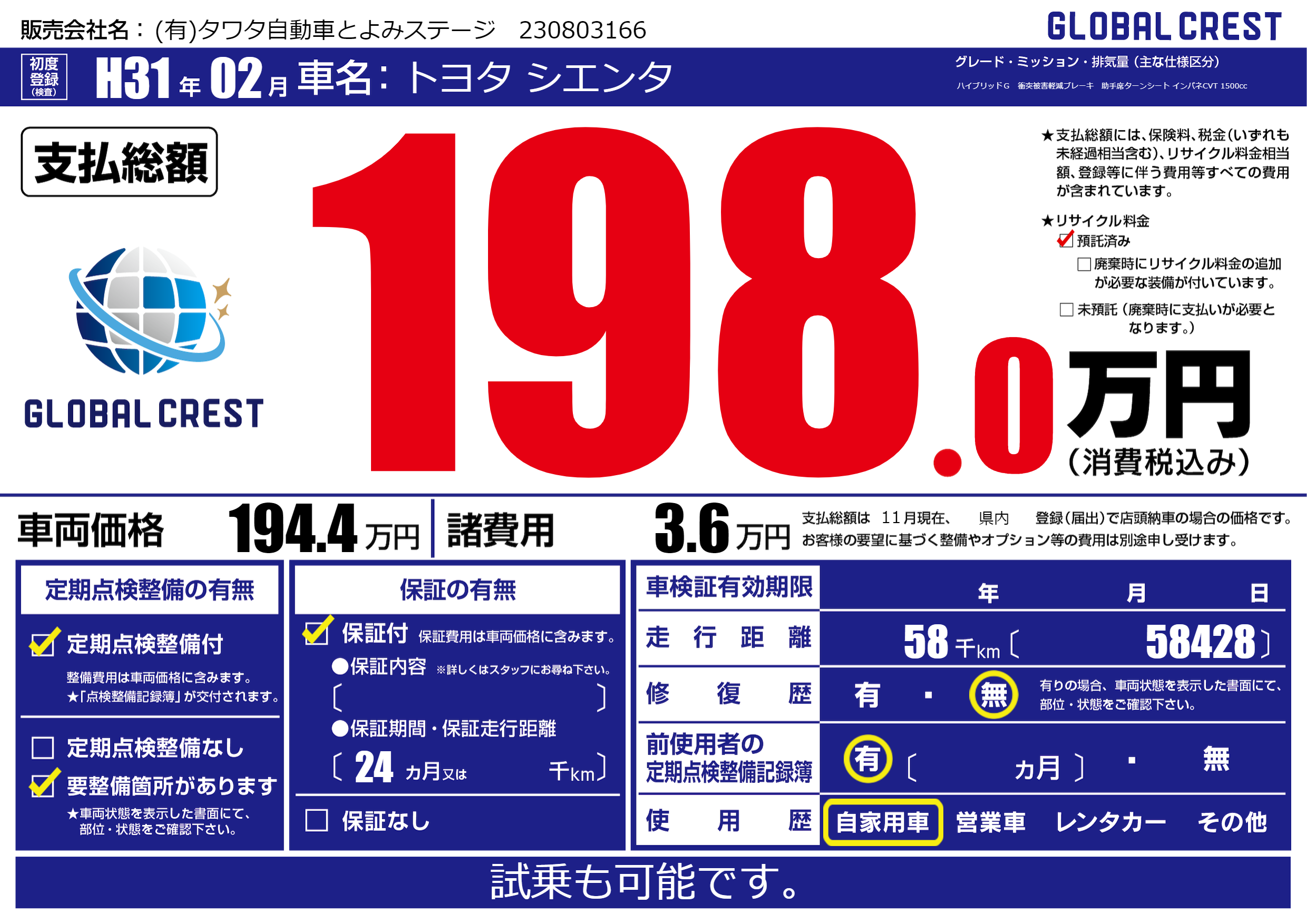 | 初年度登録 | H31年02月 | ||
