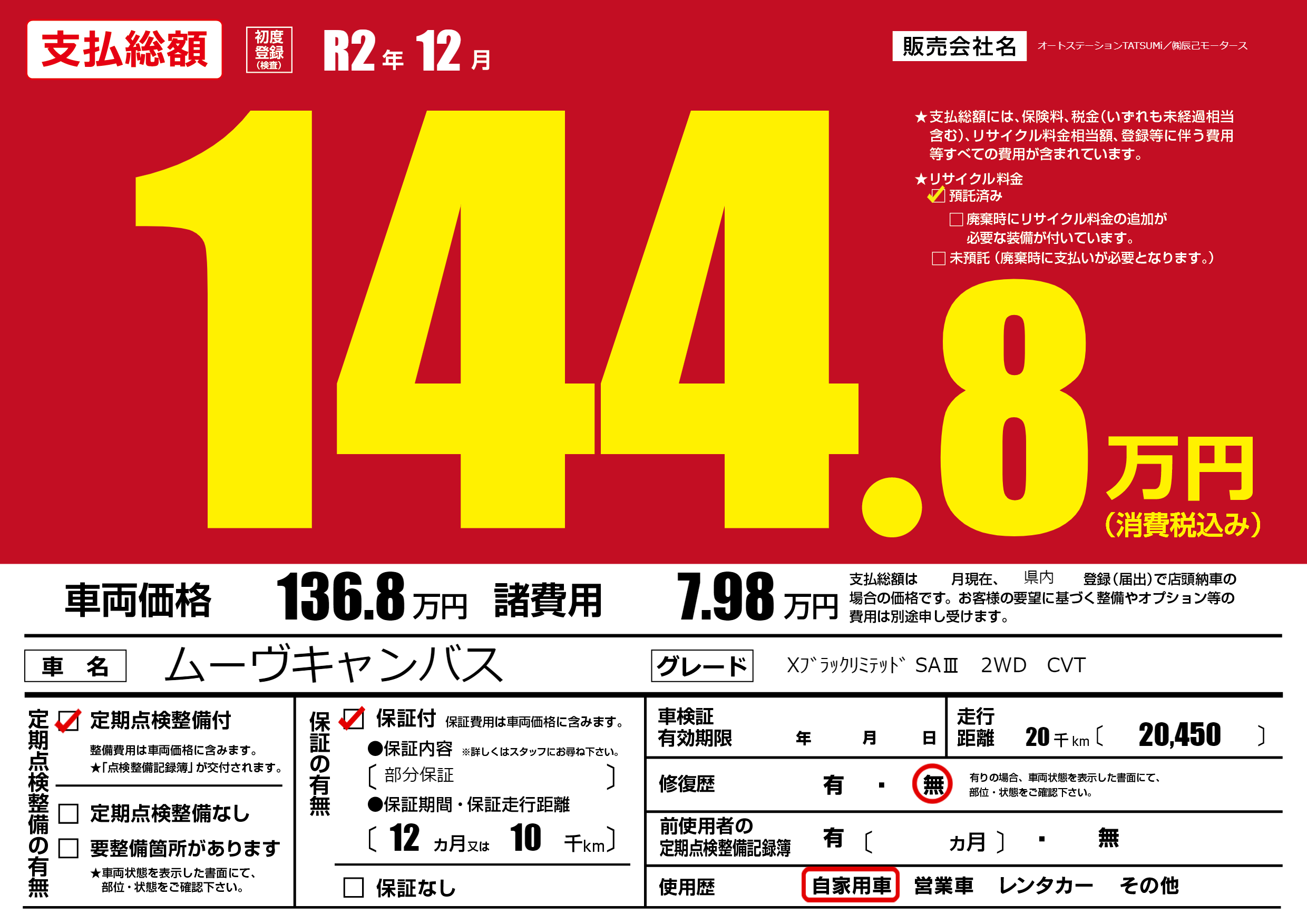 | 走行キロ | 2万km | 初年度登録 | R2年12月 |