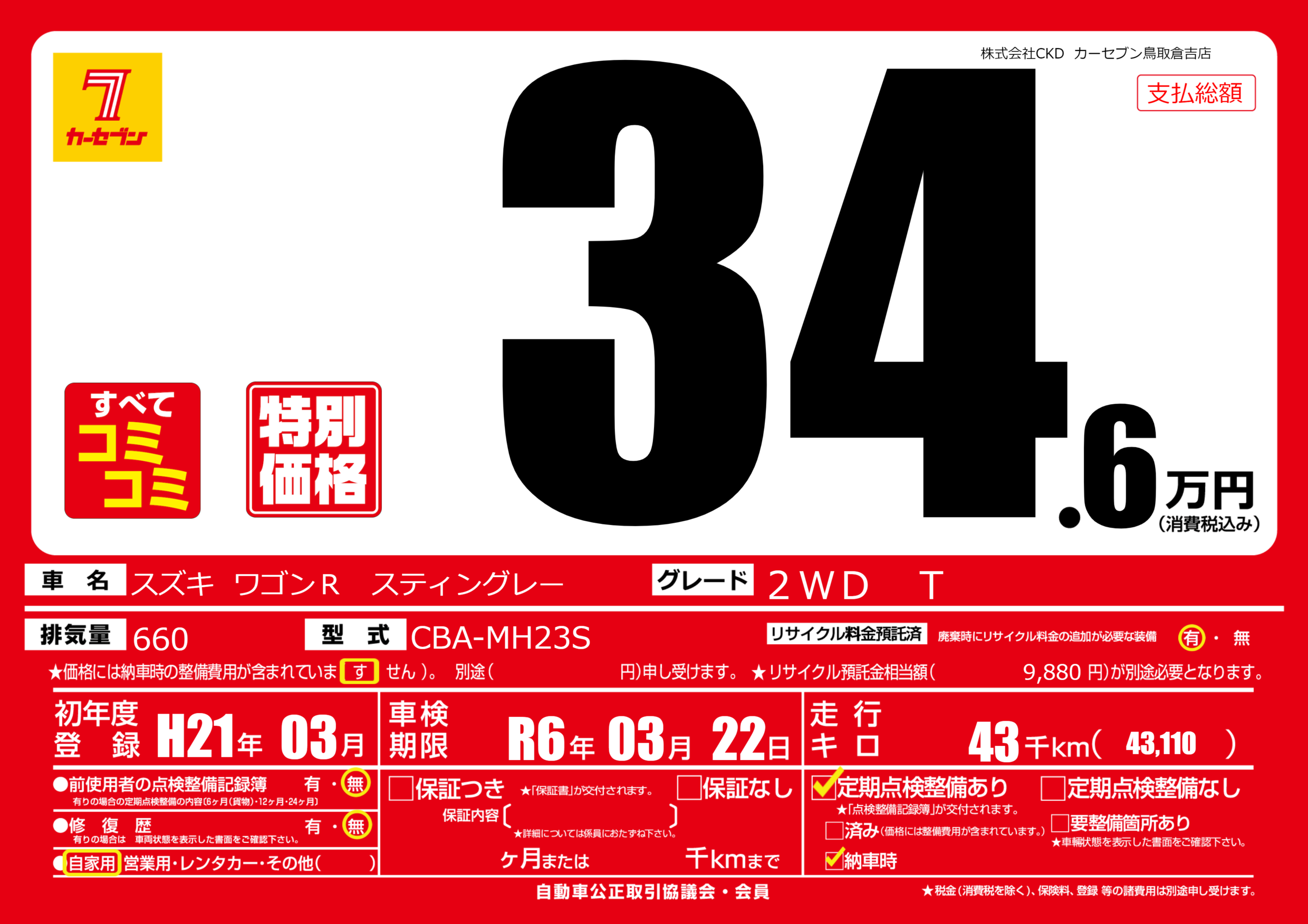 | 走行キロ | 4.3万km | 初年度登録 | H21年03月 |