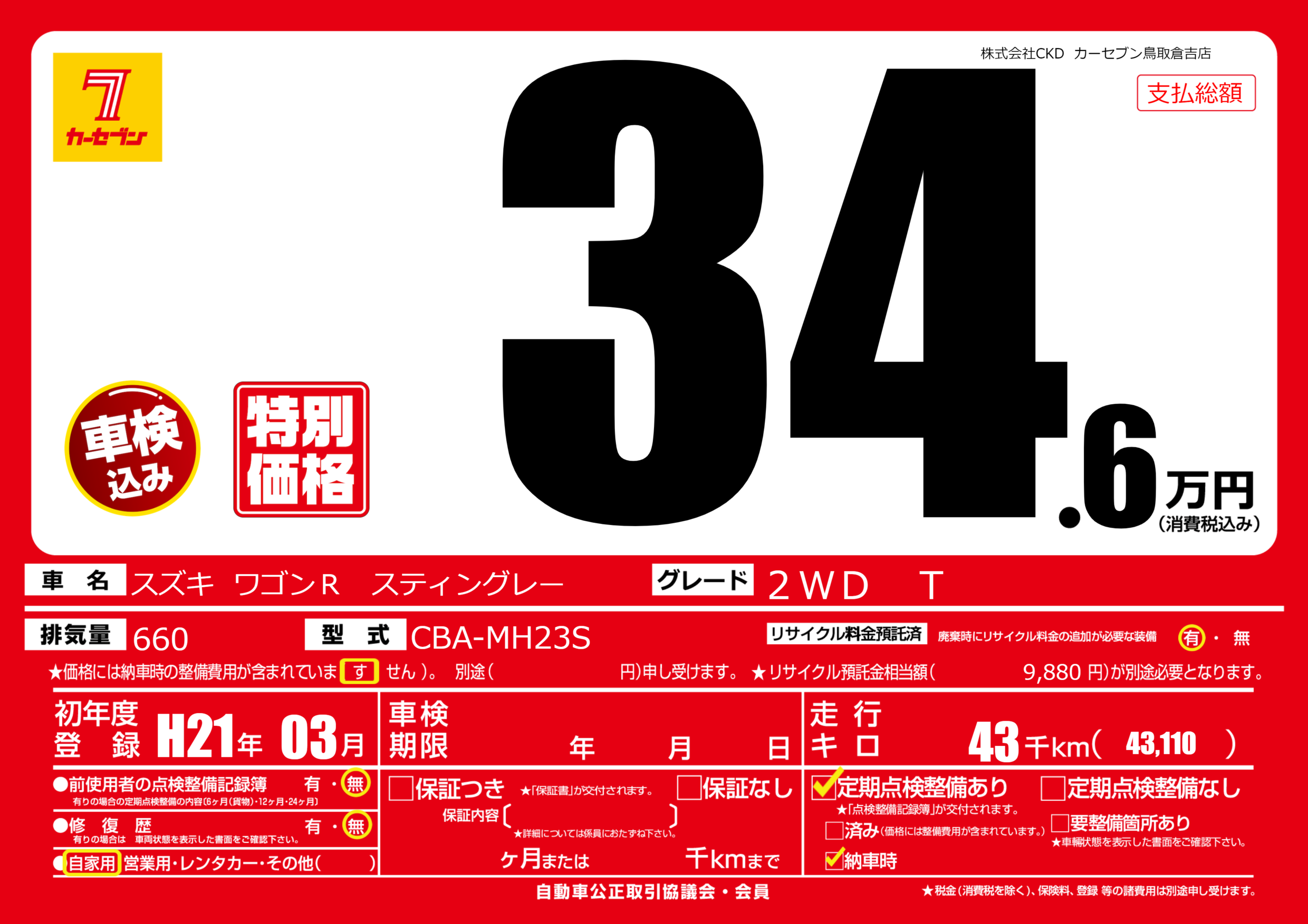| 走行キロ | 4.3万km | 初年度登録 | H21年03月 |