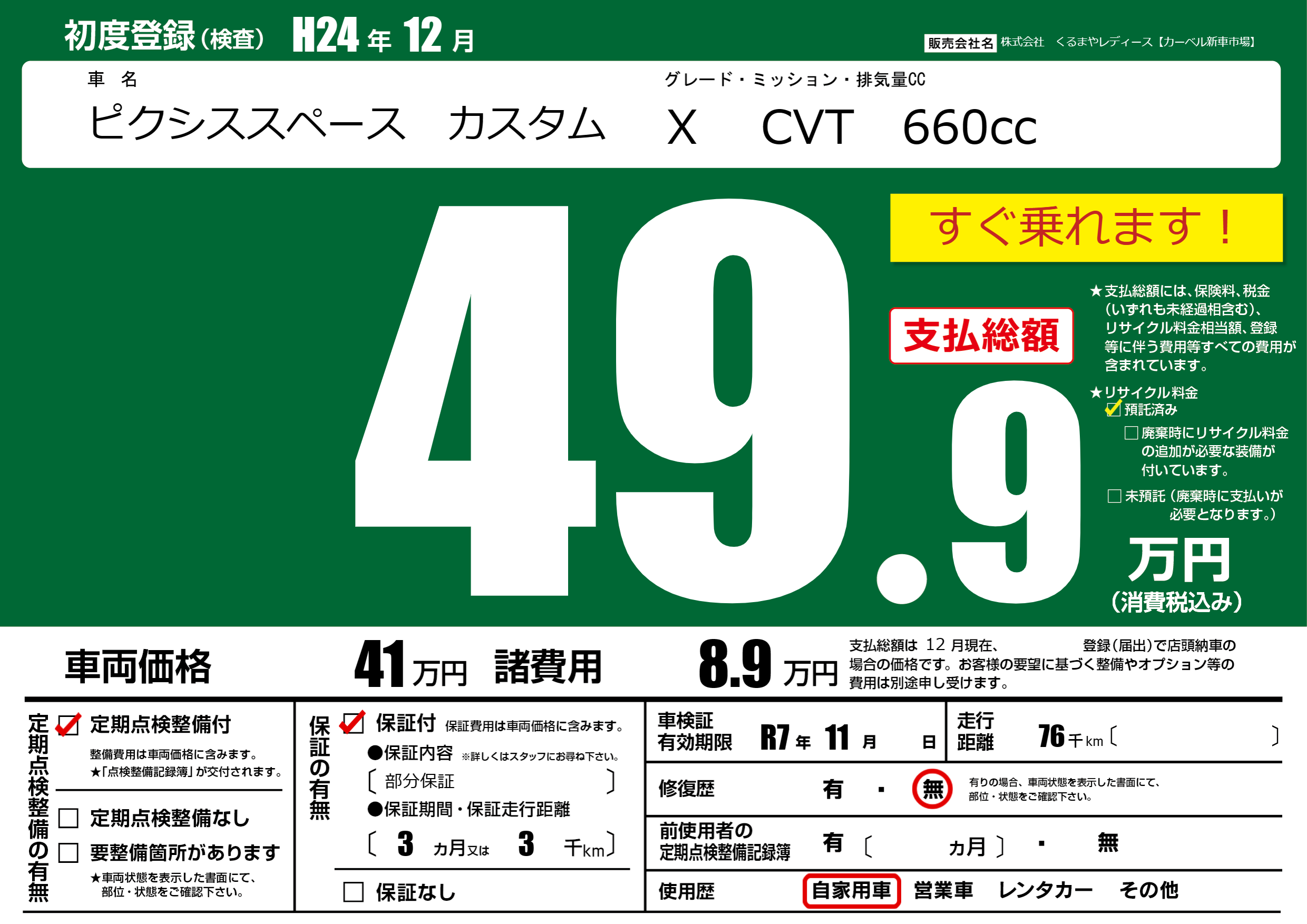 | 走行キロ | 7.6万km | 初年度登録 | H24年12月 |