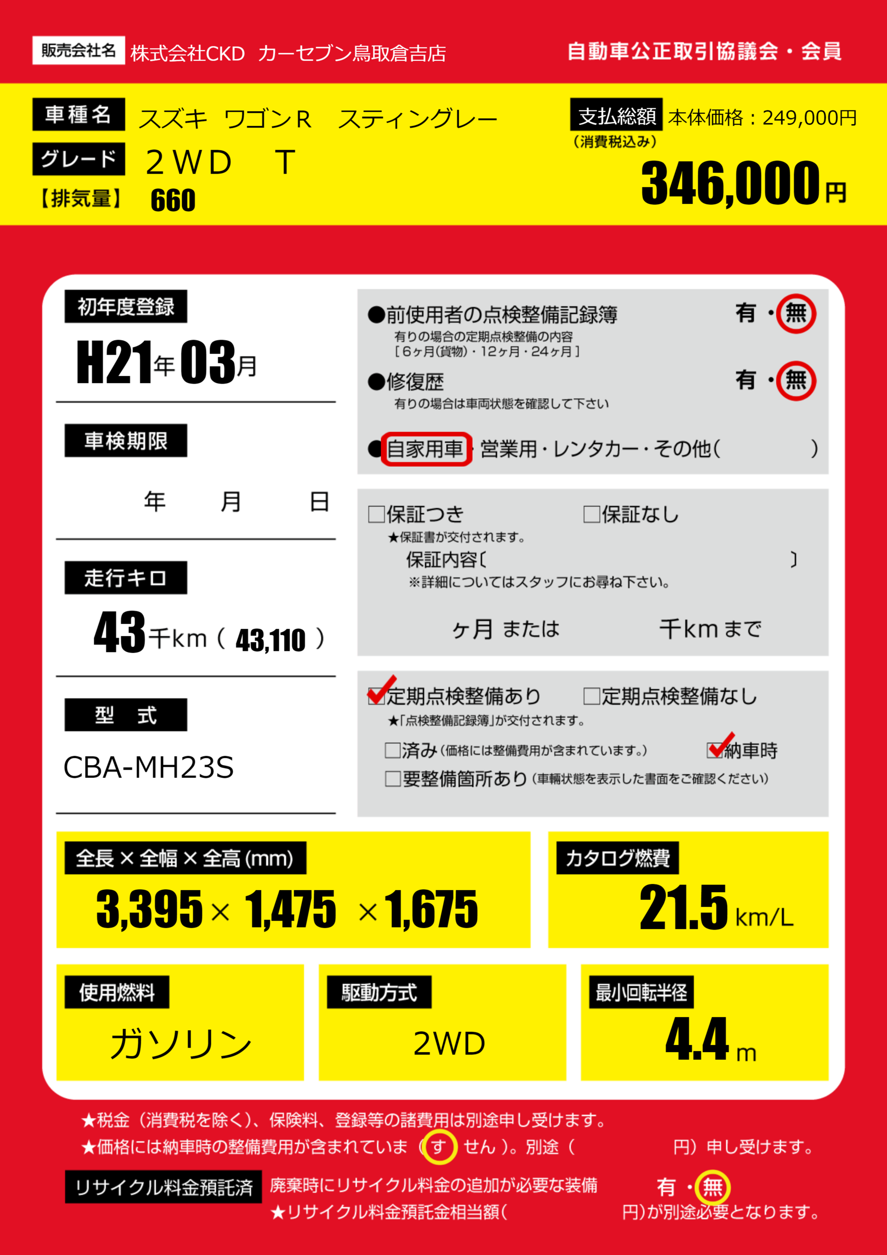 | 走行キロ | 4.3万km | 初年度登録 | H21年03月 |