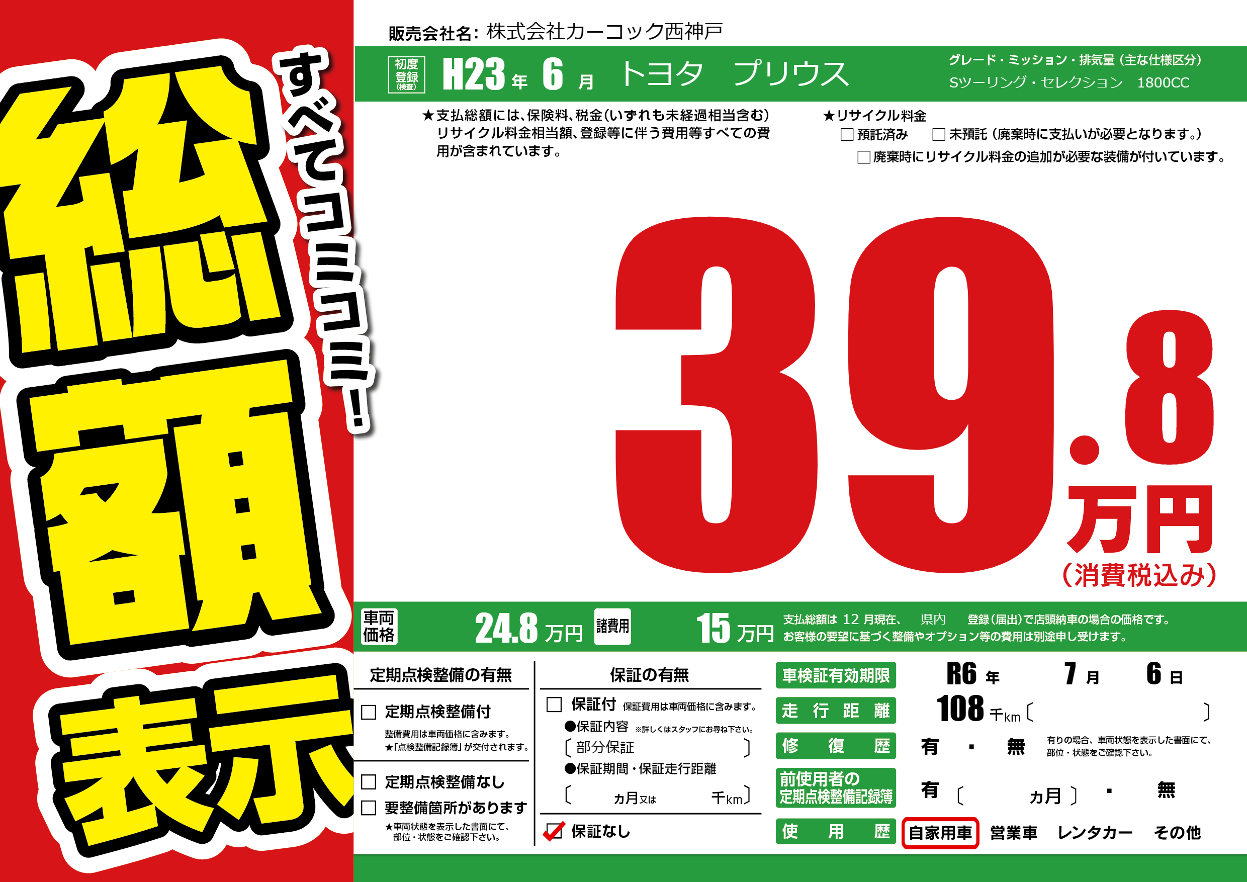 | 車名 | トヨタ プリウス | グレード ミッション 排気量 |