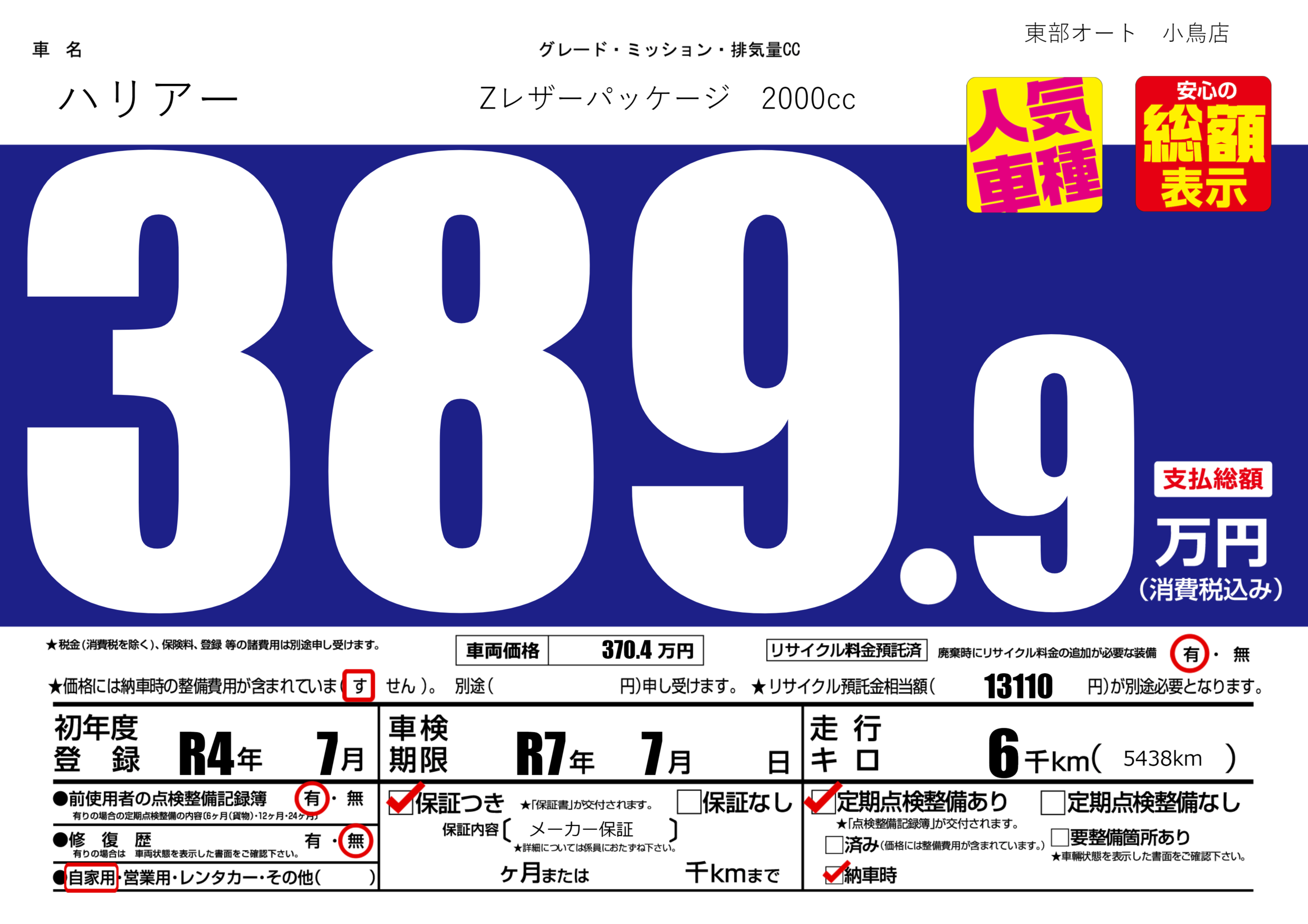 あり | 車検制限 | R7年7月---月 |