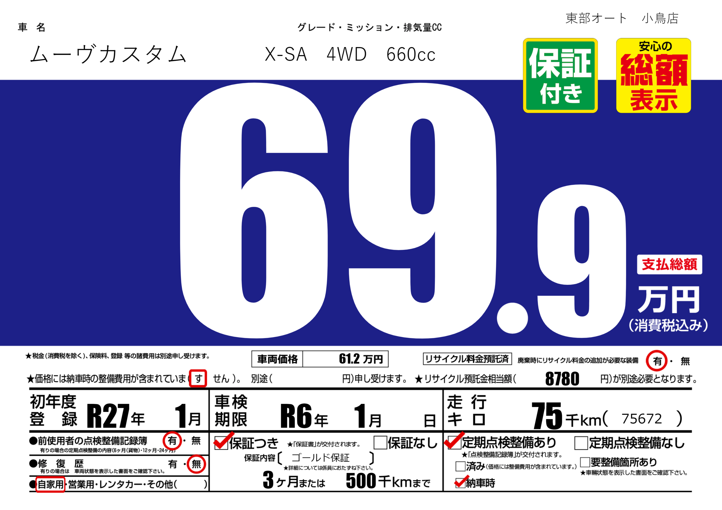 | 定期点検整備 | 定期点検整備あり 納車時あり | ||