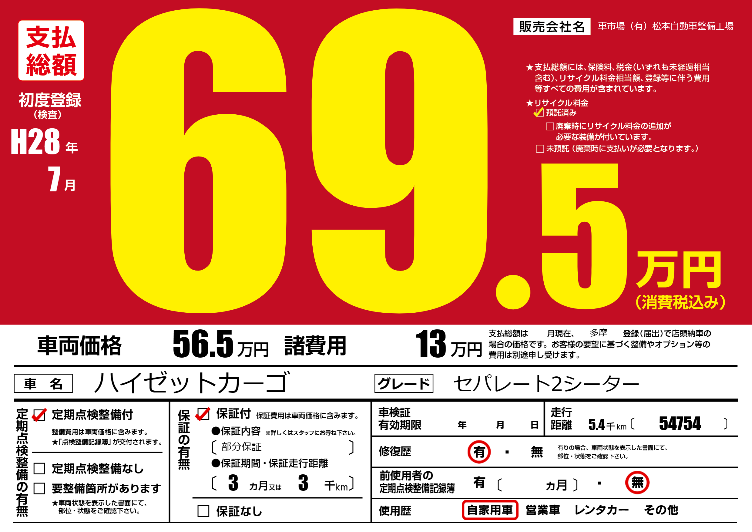 | 車名 | ハイゼットカーゴ | グレード ミッション 排気量 |