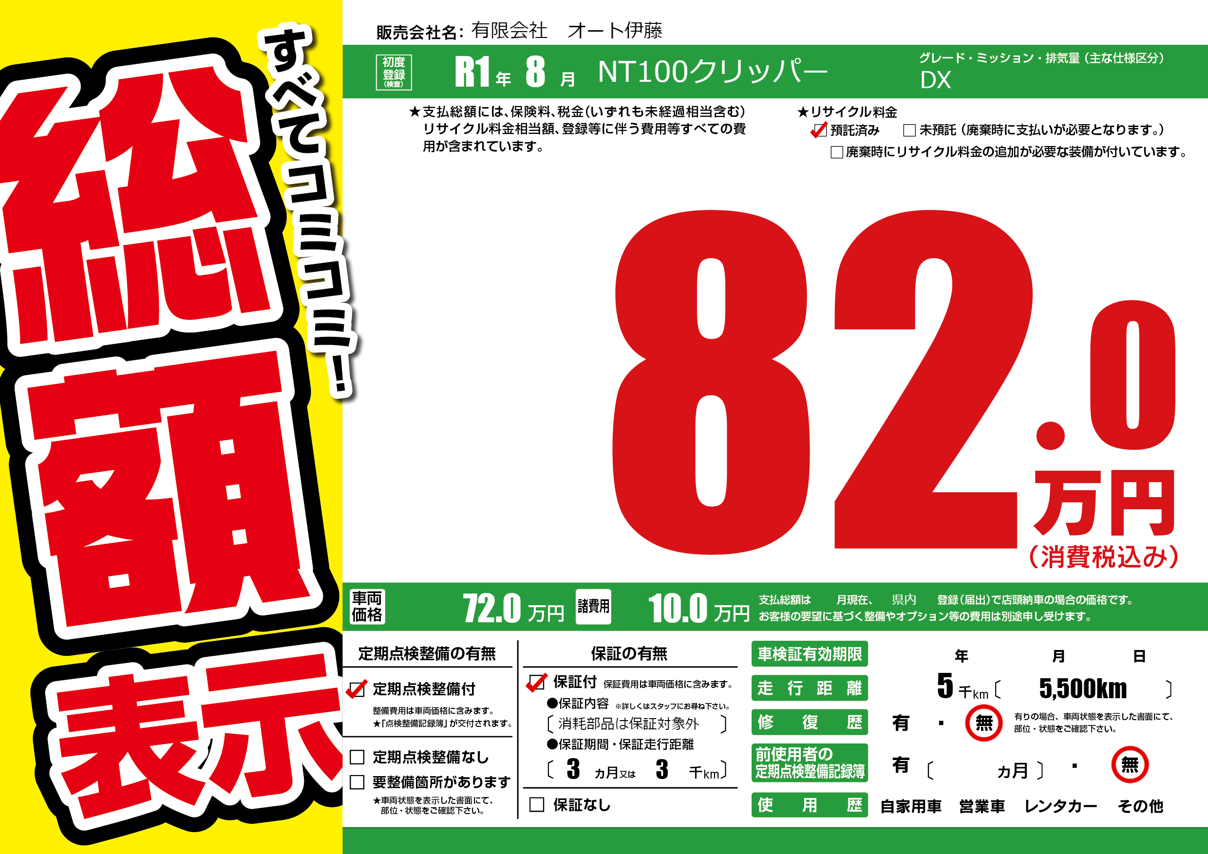 保証付き 保証内容(消耗部品は保証対象外) 3ヶ月または(3)千kmまで |