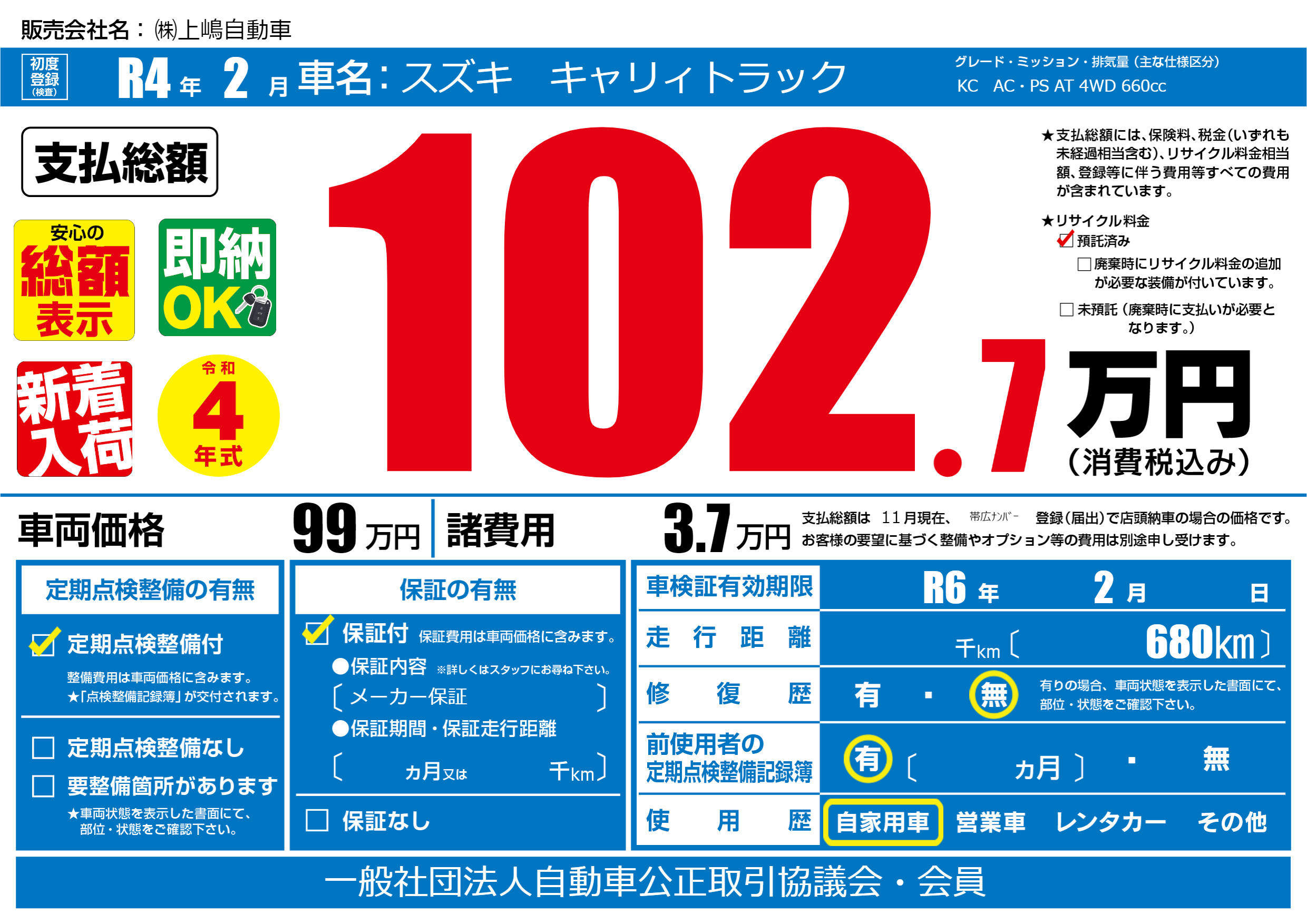 | 車名 | スズキ キャリィトラック | グレード ミッション 排気量 |