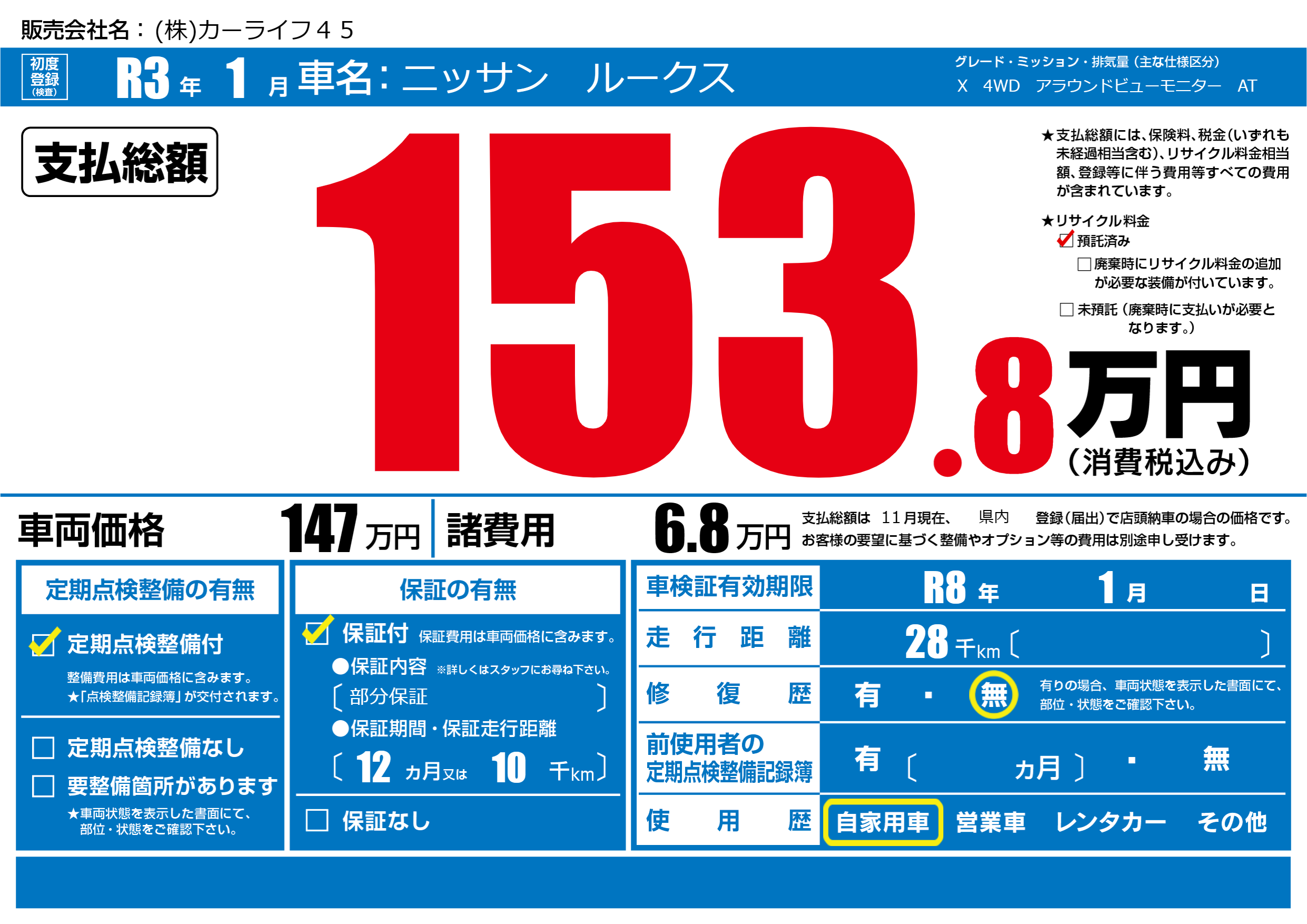| 車名 | ニッサン ルークス | グレード ミッション 排気量 |