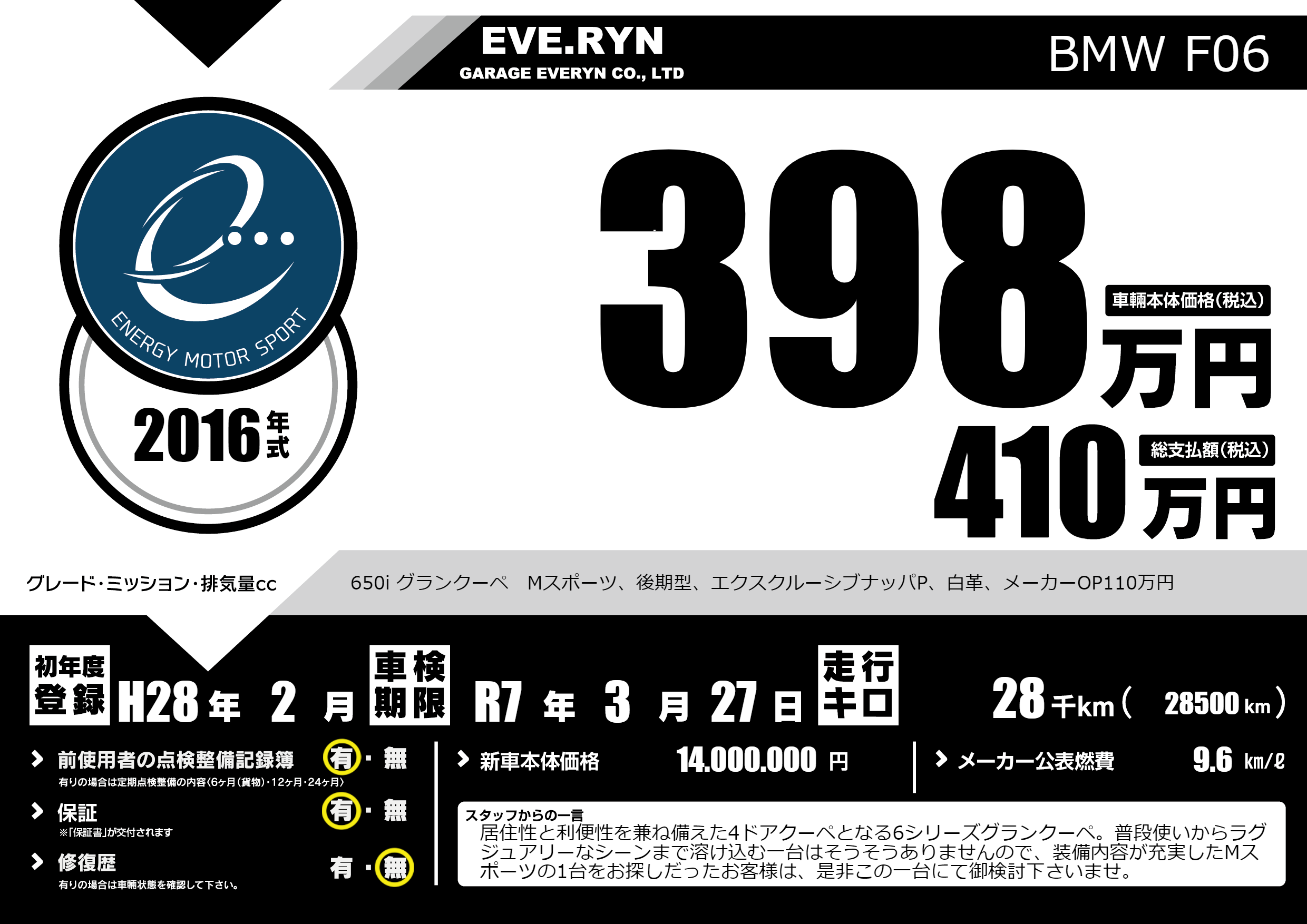 650i グランクーペ Mスポーツ、後期型、エクスクルーシブナッパP、白革、メーカーOP110万円 |