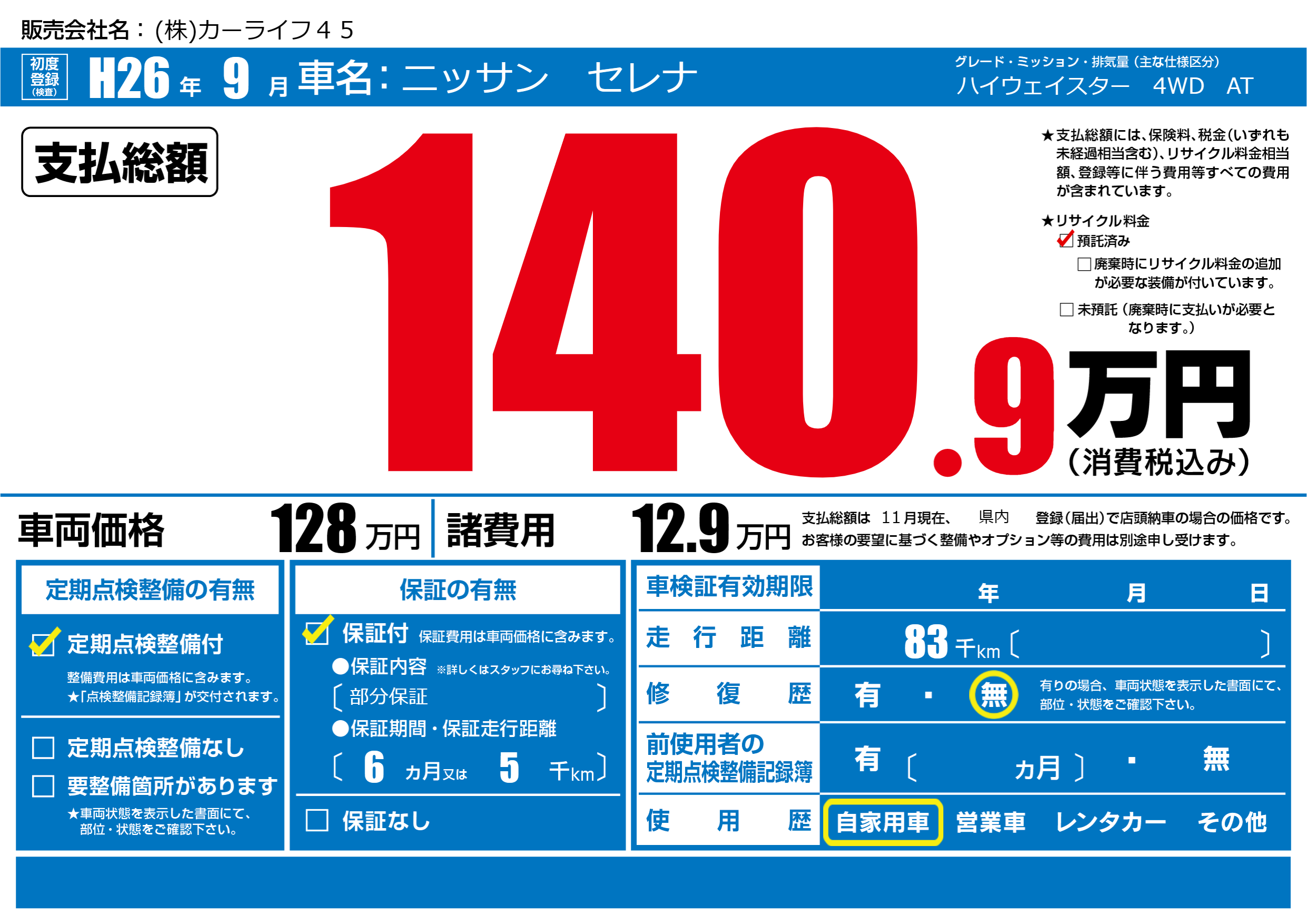 | 走行キロ | 8.3万km | 初年度登録 | H26年9月 |