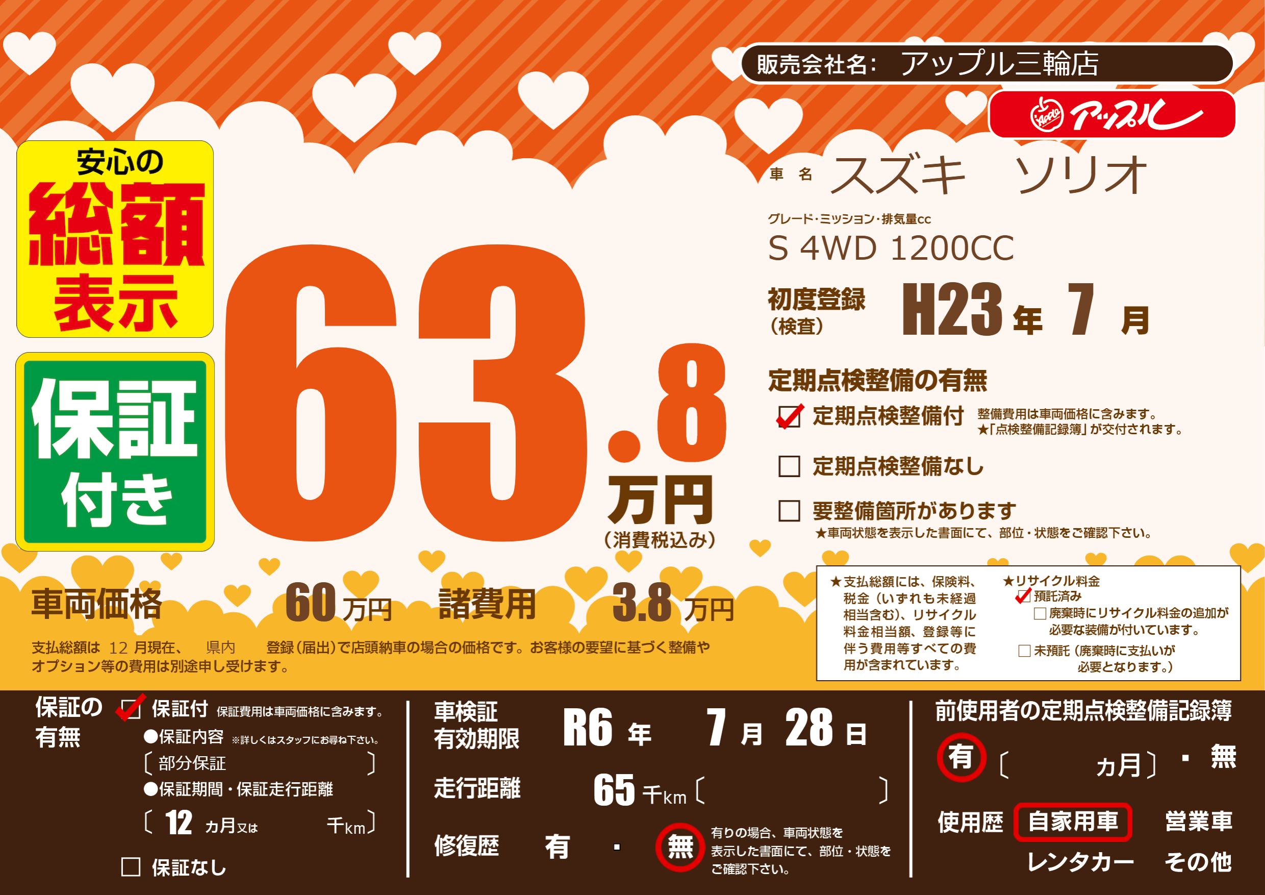 保証付き 保証内容(部分保証) 12ヶ月または()千kmまで |