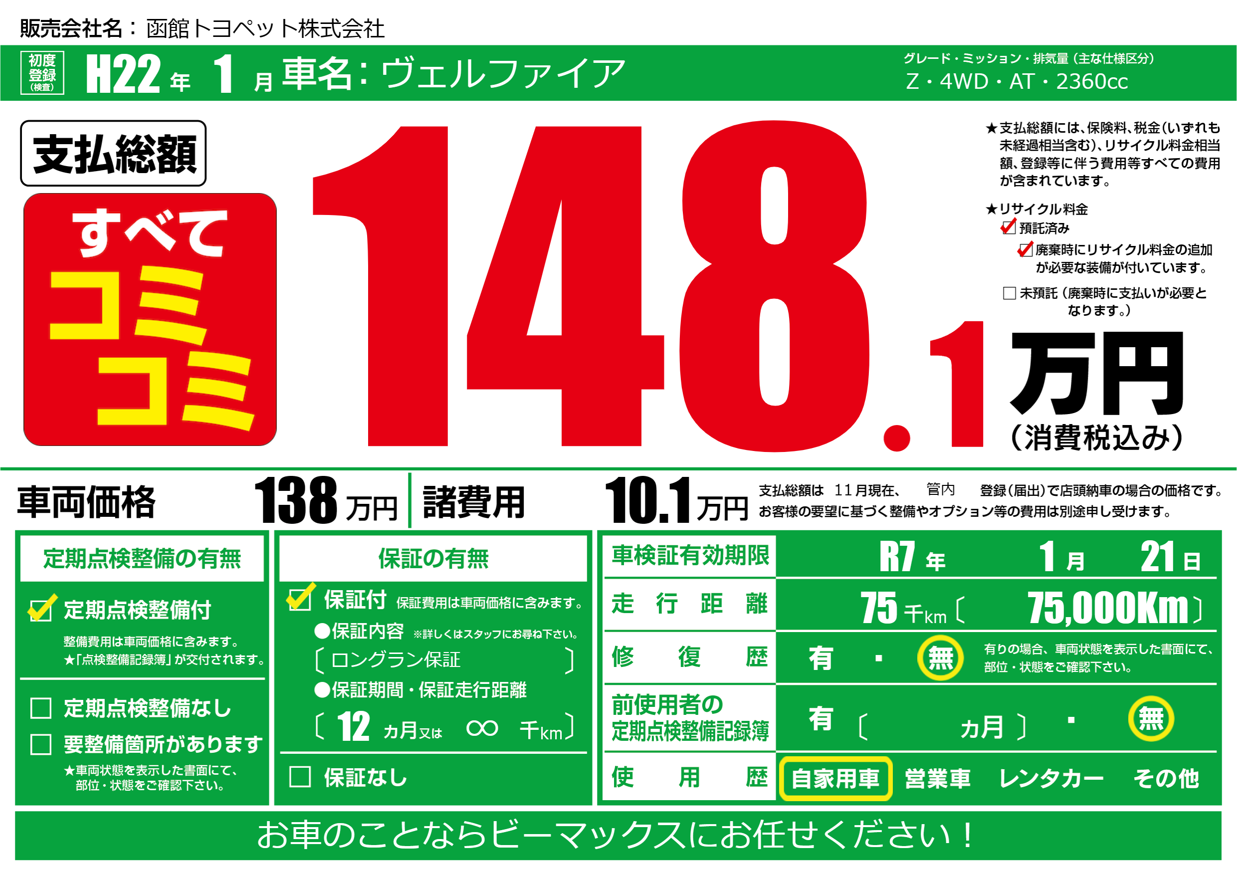 | 走行キロ | 7.5万km | 初年度登録 | H22年1月 |
