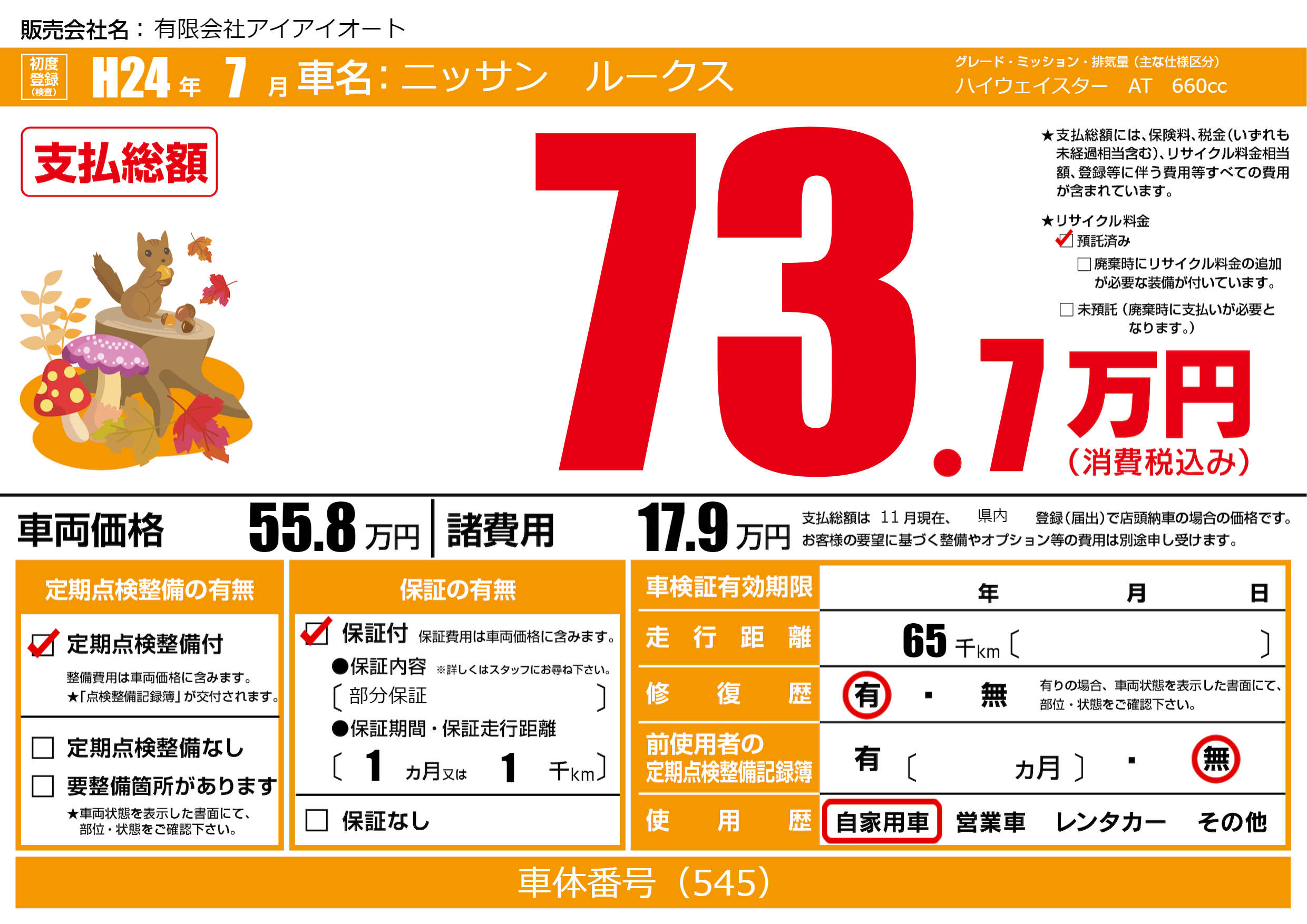| 走行キロ | 6.5万km | 初年度登録 | H24年7月 |