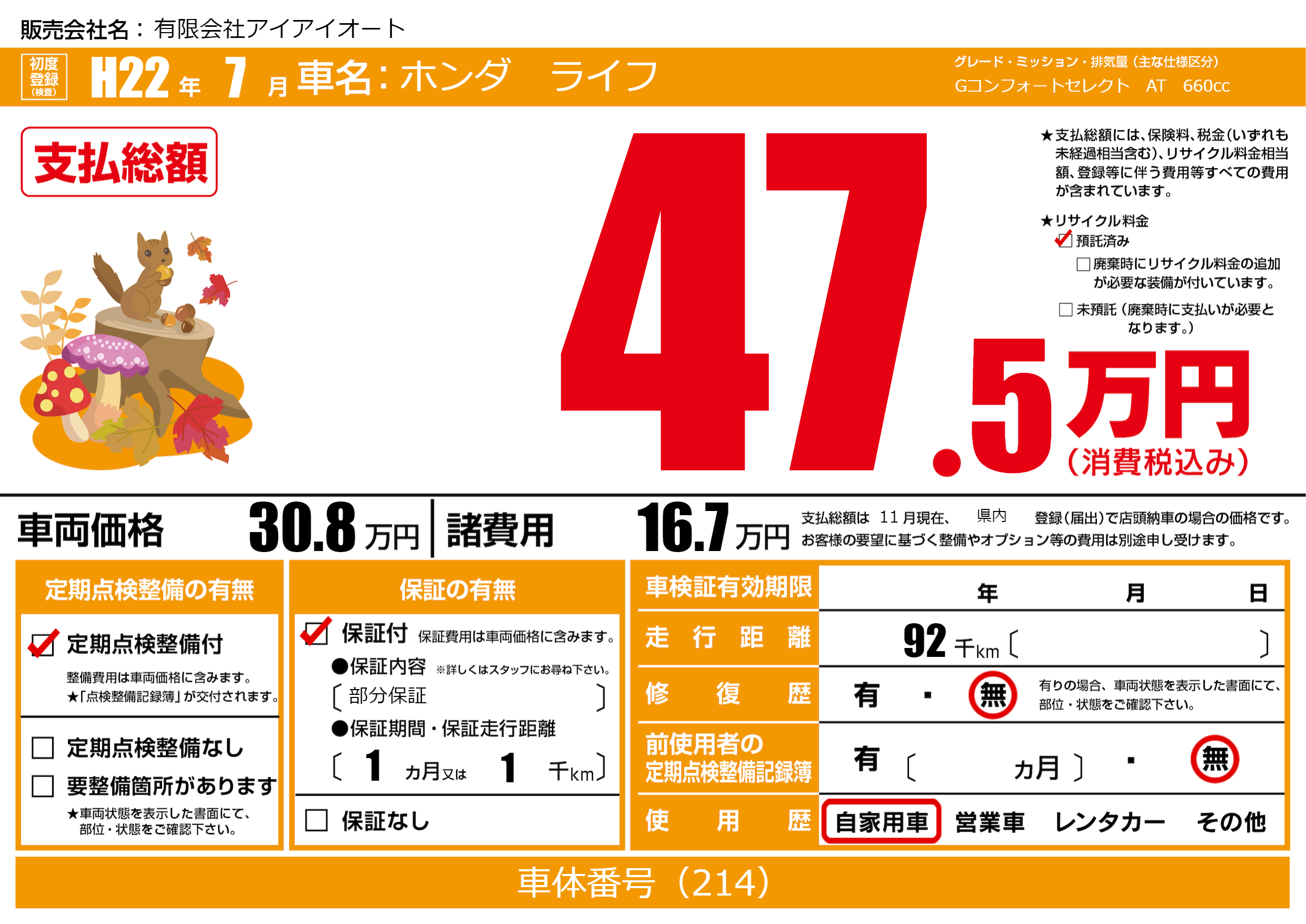 | 車名 | ホンダ ライフ | グレード ミッション 排気量 |