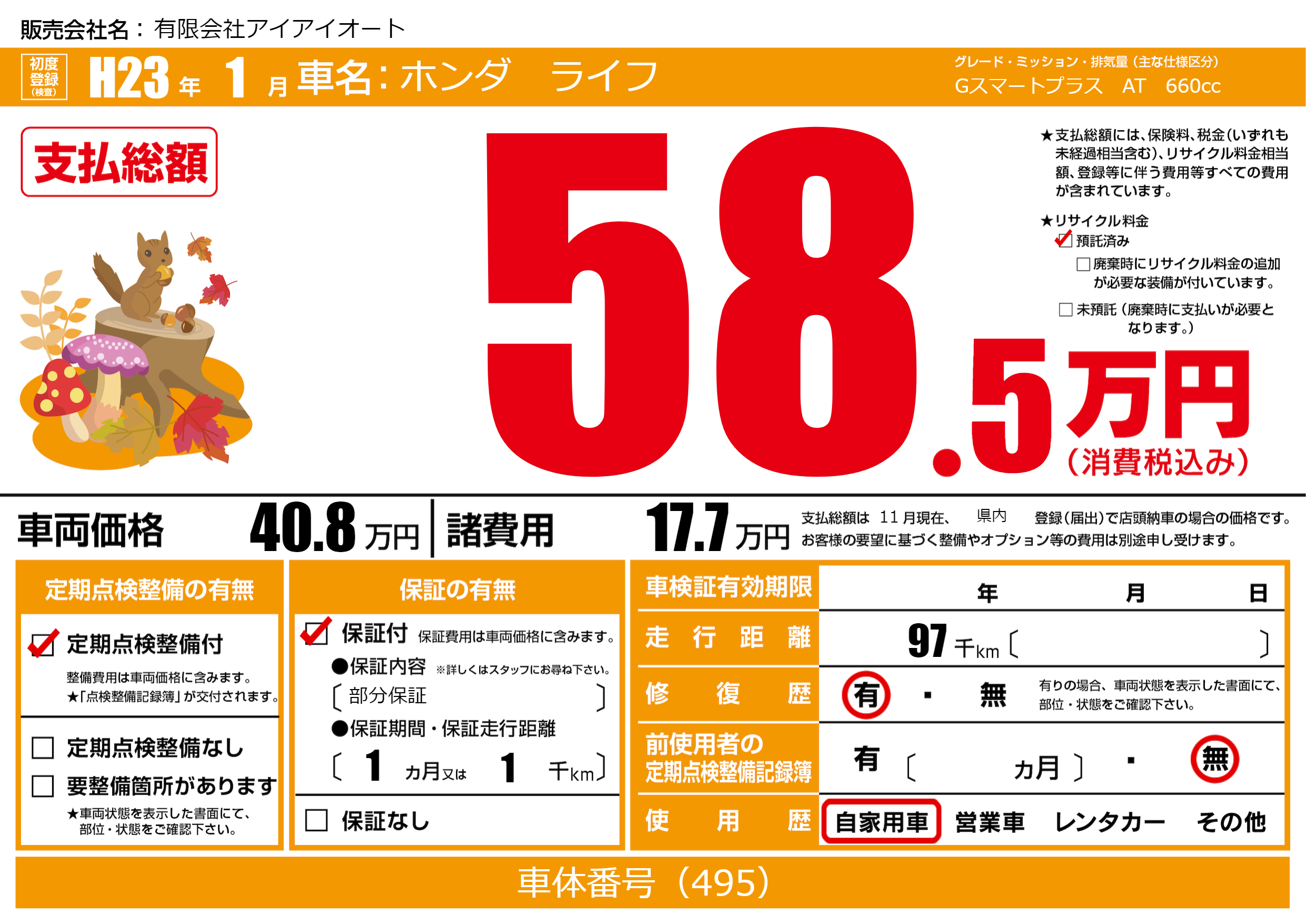| 車名 | ホンダ ライフ | グレード ミッション 排気量 |