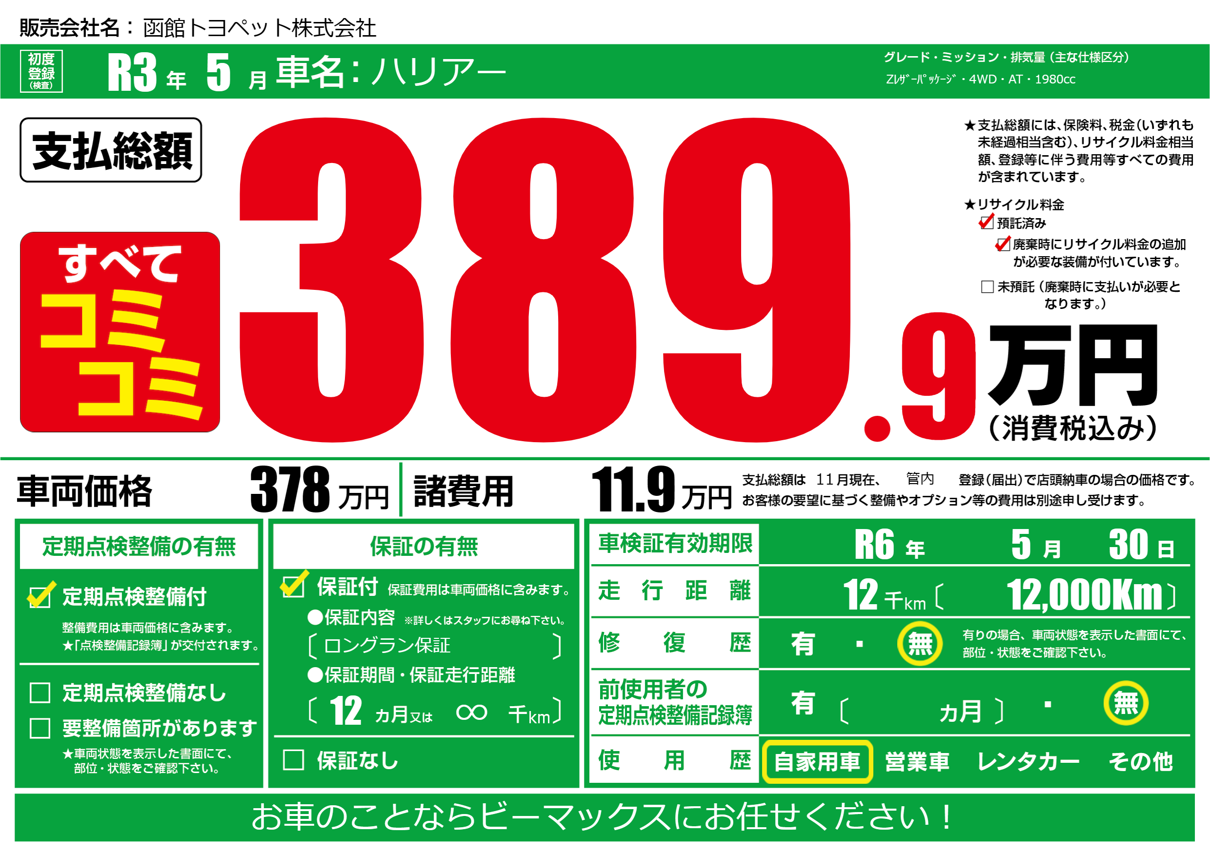 | 走行キロ | 1.2万km | 初年度登録 | R3年5月 |