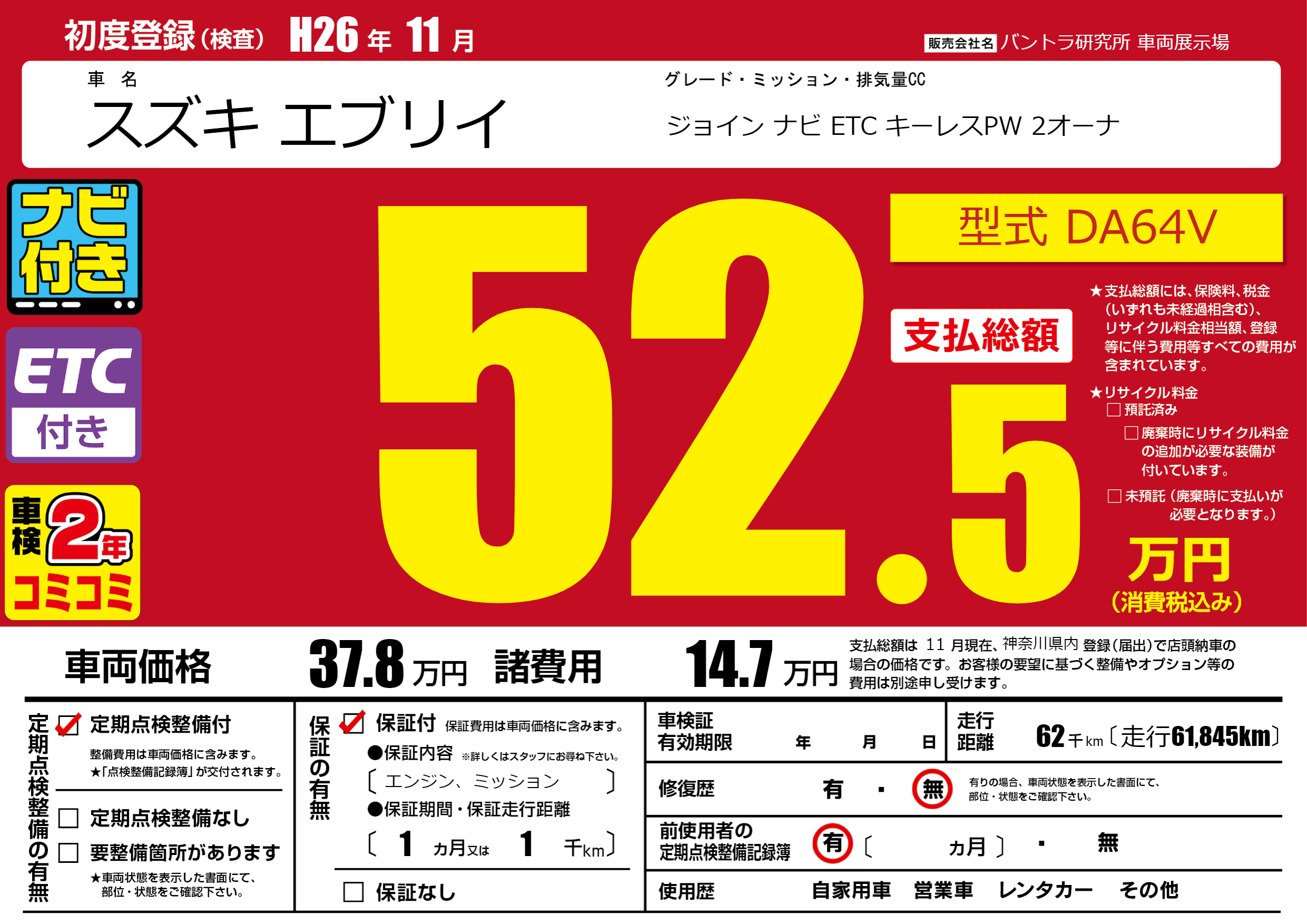 | 車名 | スズキ エブリイ | グレード ミッション 排気量 |