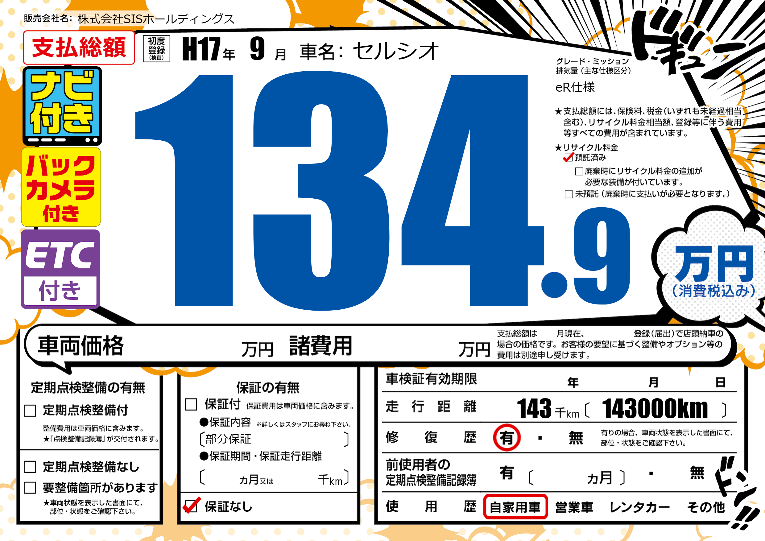 | 走行キロ | 14.3万km | 初年度登録 | H17年9月 |