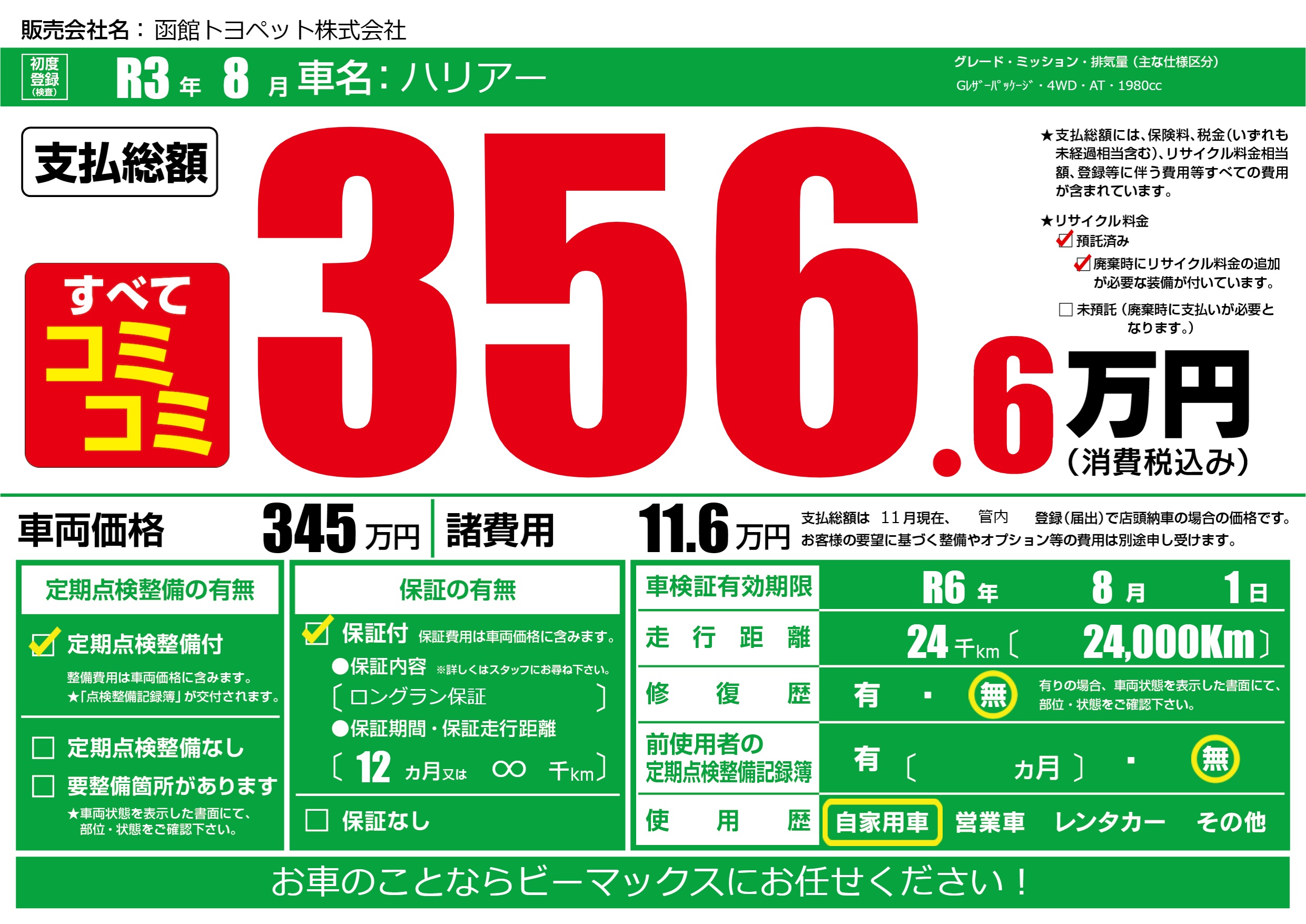 | 走行キロ | 2.4万km | 初年度登録 | R3年8月 |