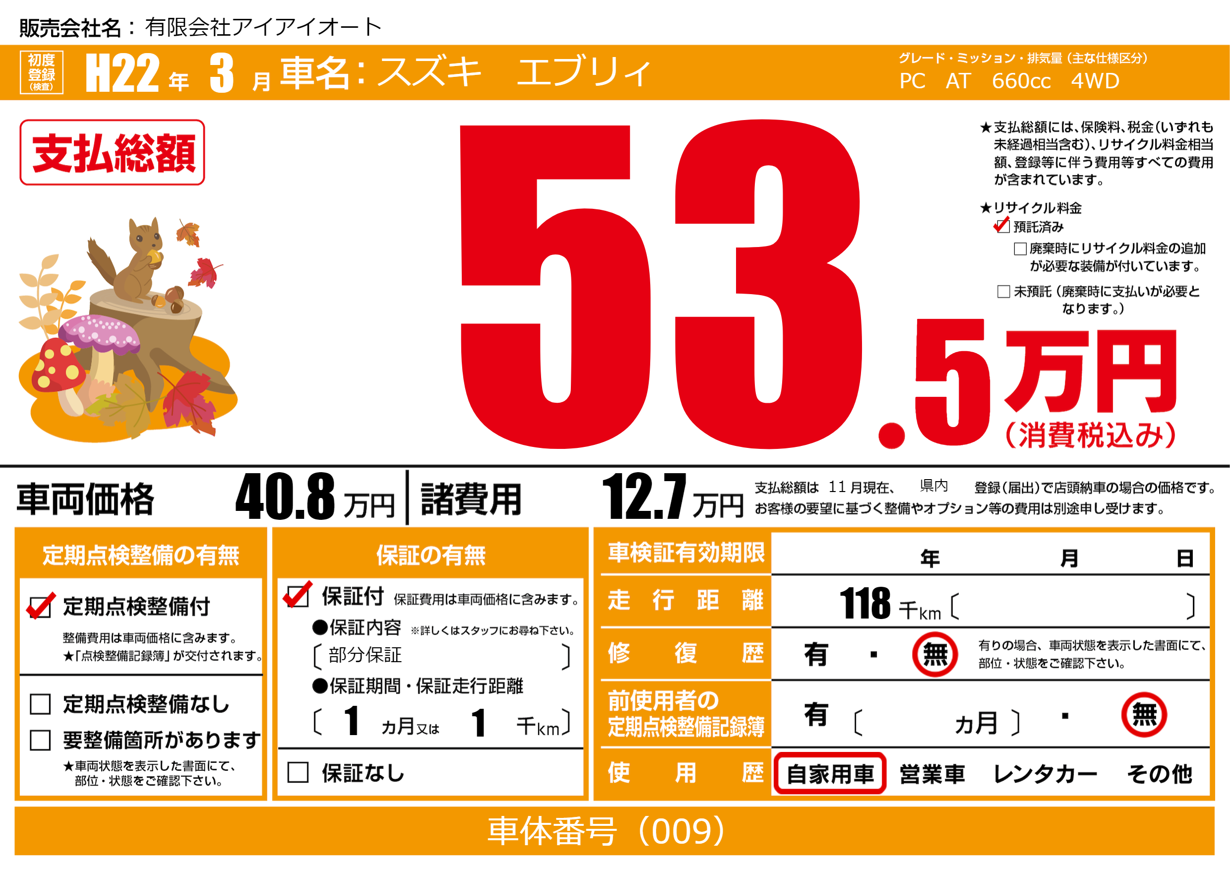 | 車名 | スズキ エブリィ | グレード ミッション 排気量 |
