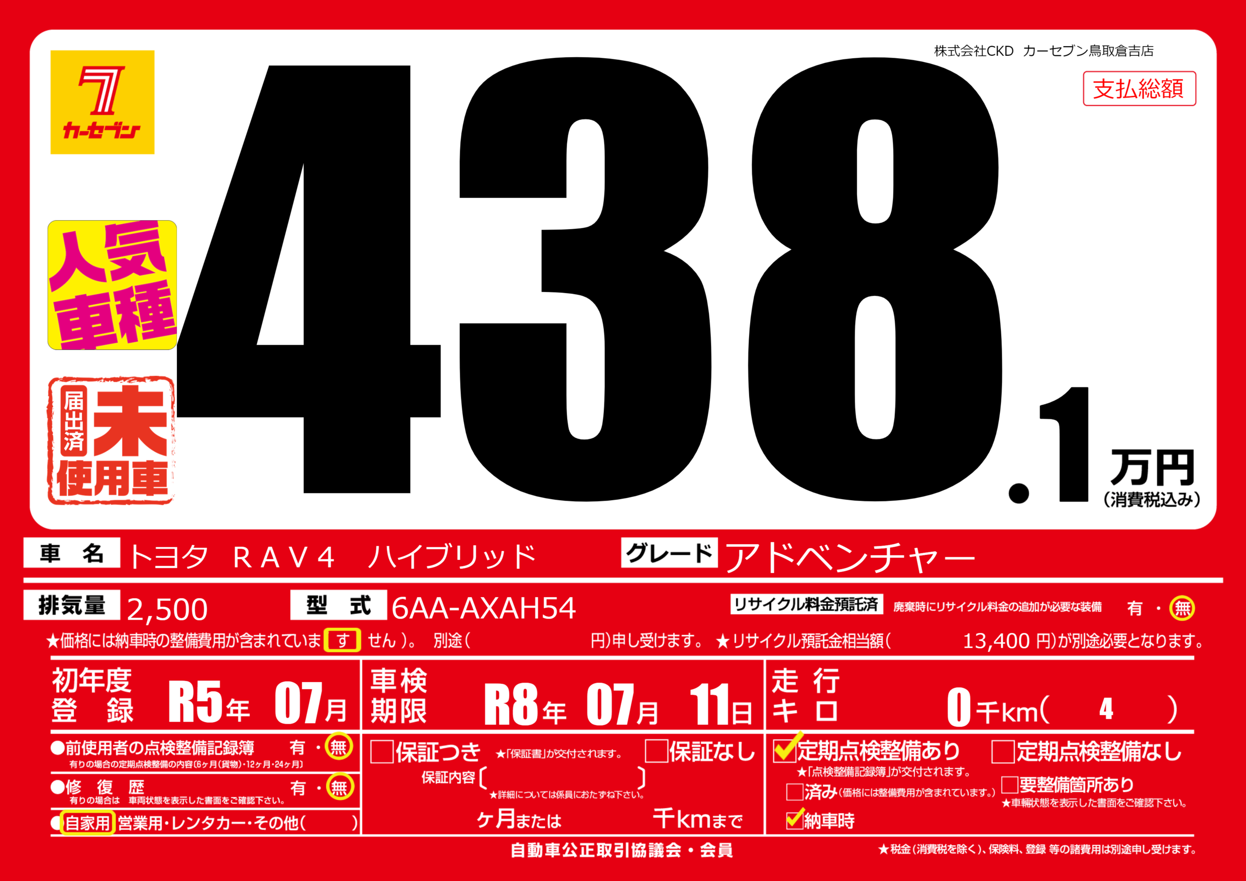 | 走行キロ | - | 初年度登録 | R5年07月 |