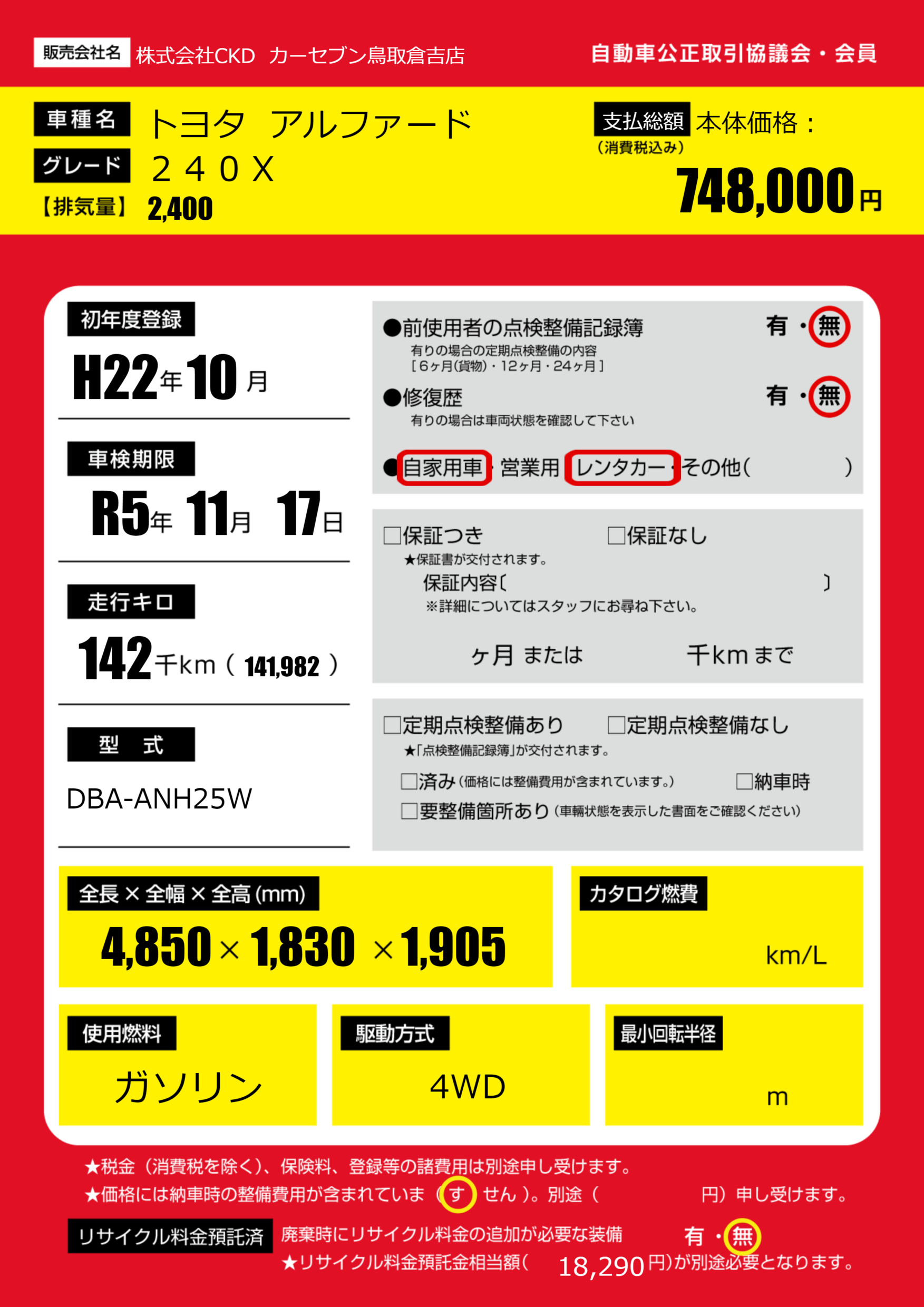 | 車名 | トヨタ アルファード | グレード ミッション 排気量 |