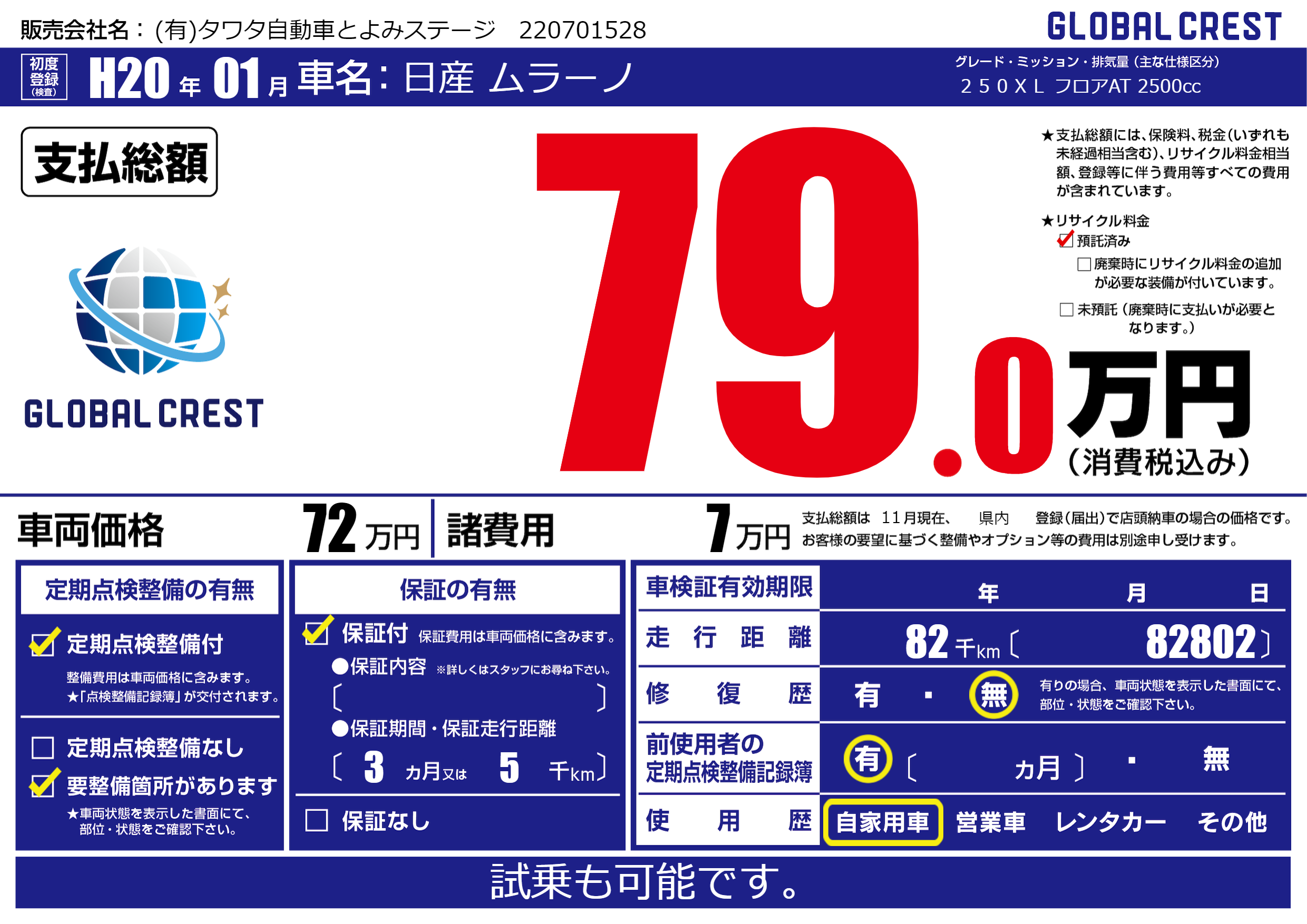 | 車名 | 日産 ムラーノ | グレード ミッション 排気量 |