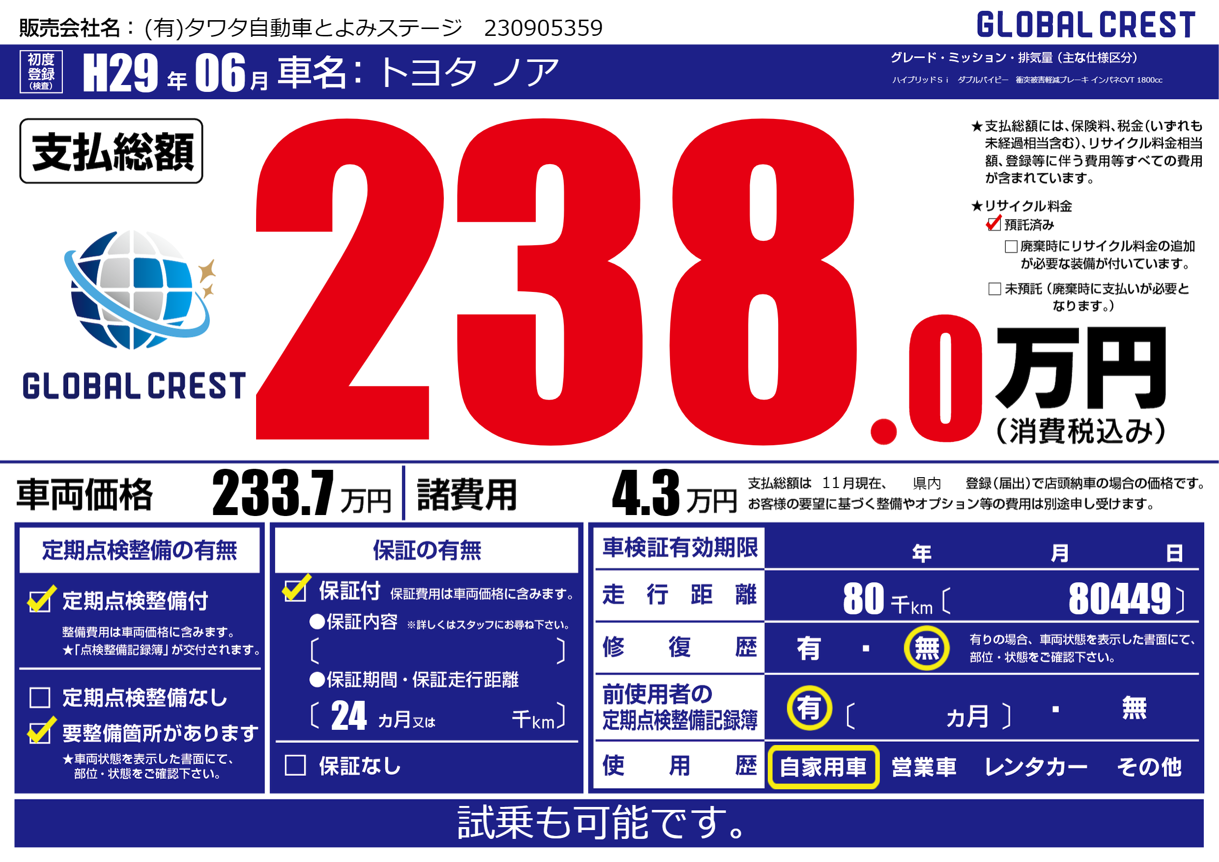 | 走行キロ | 8万km | 初年度登録 | H29年06月 |
