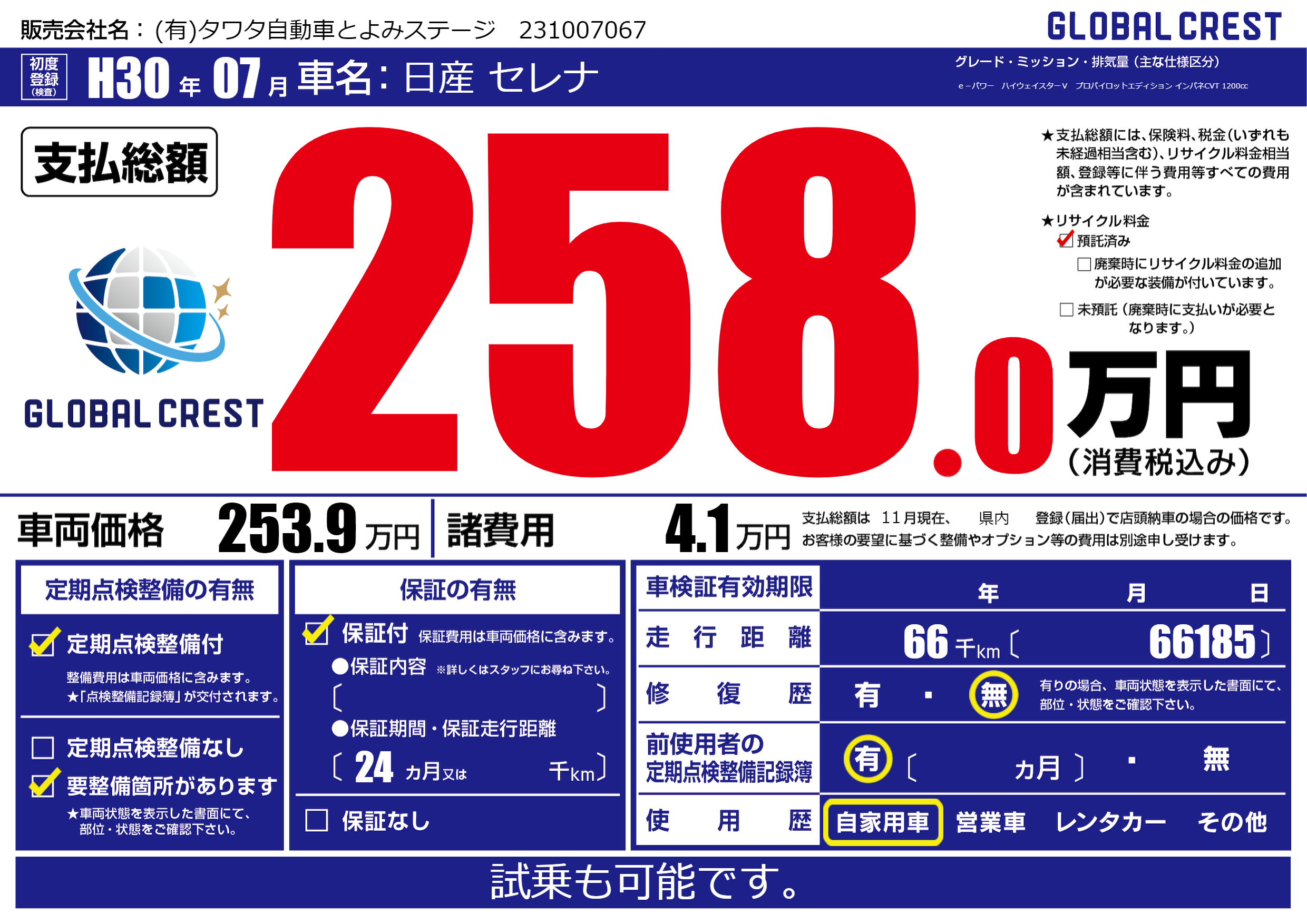 | 車名 | 日産 セレナ | グレード ミッション 排気量 |