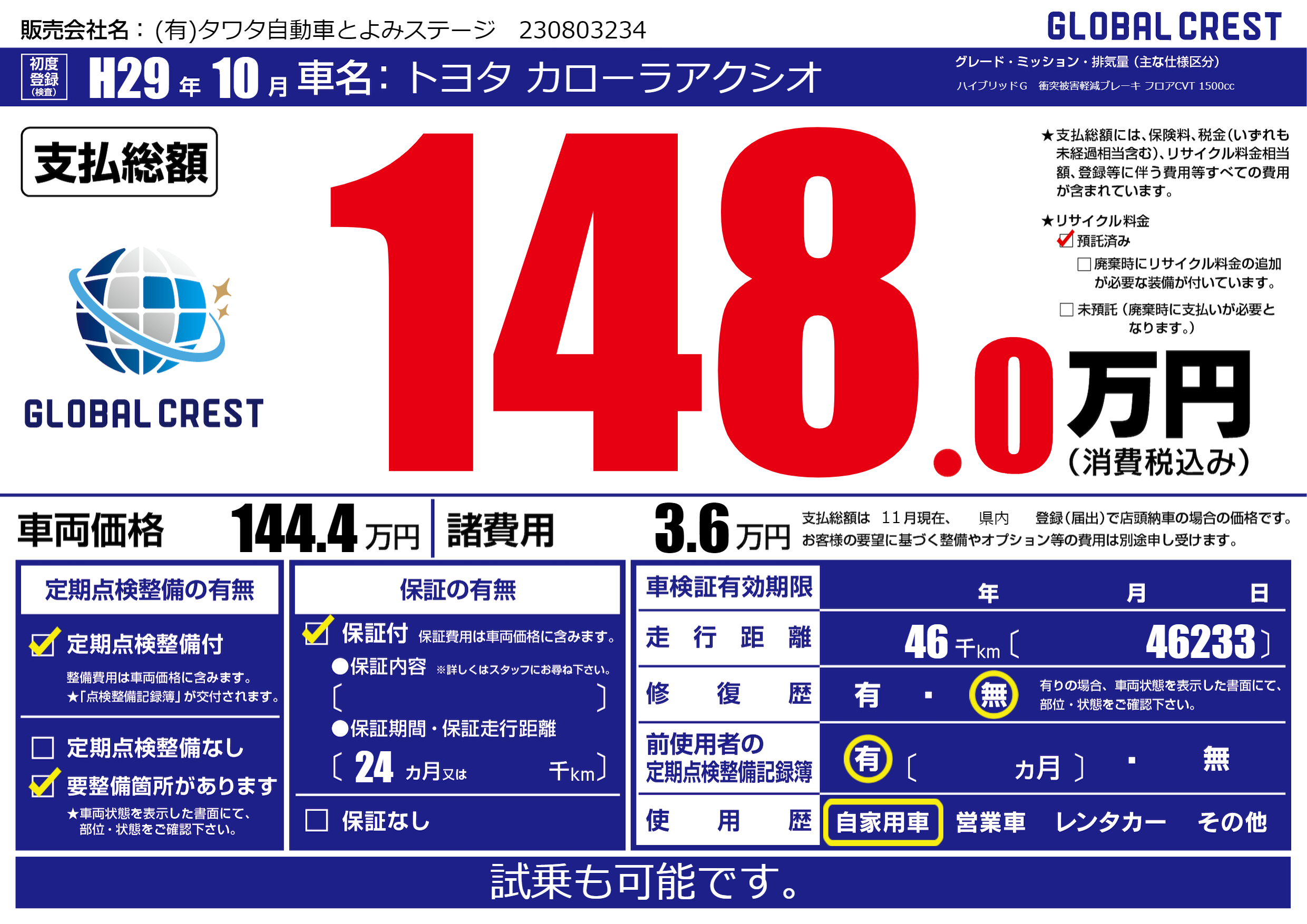 | 走行キロ | 4.6万km | 初年度登録 | H29年10月 |