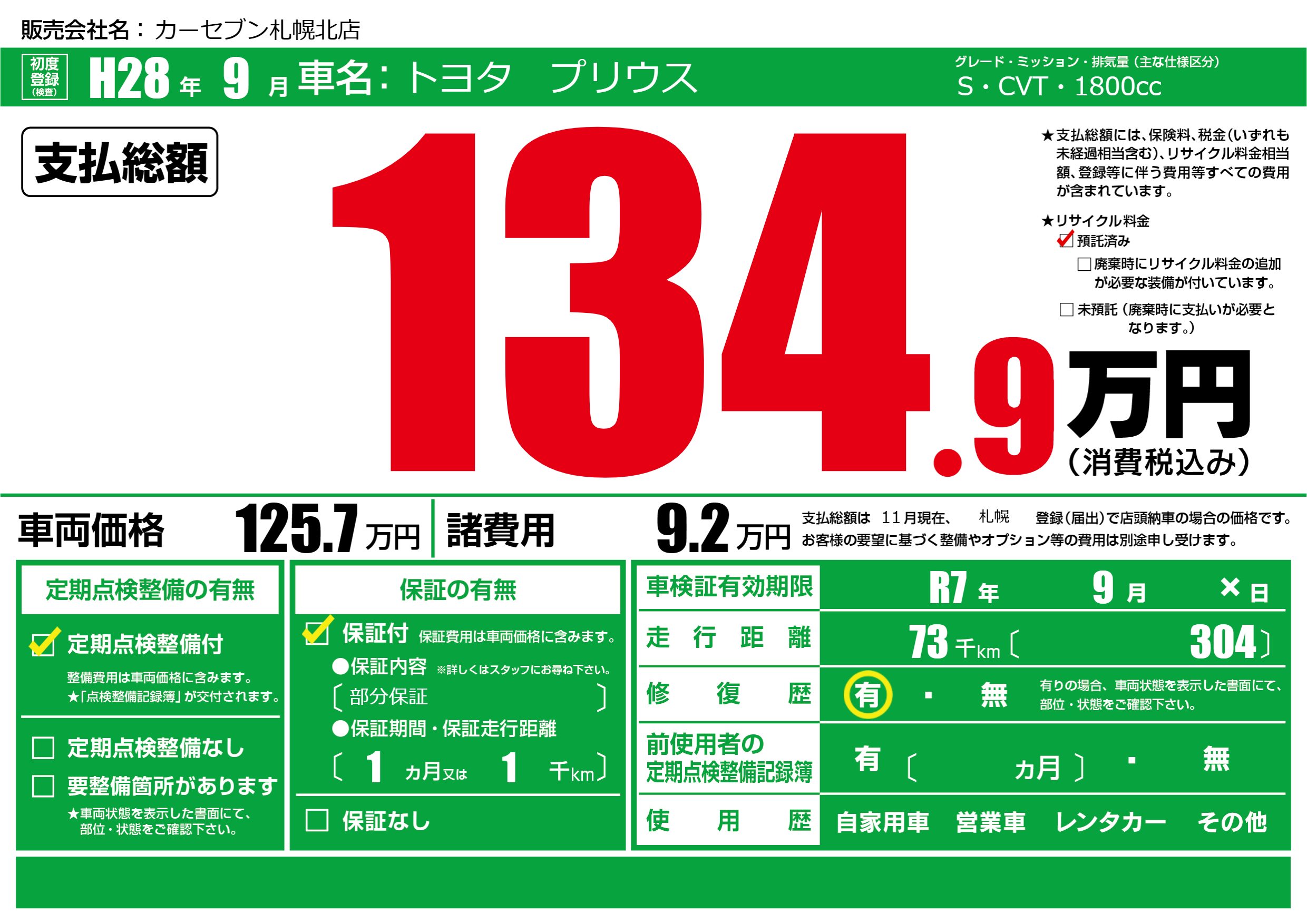 | 車名 | トヨタ プリウス | グレード ミッション 排気量 |