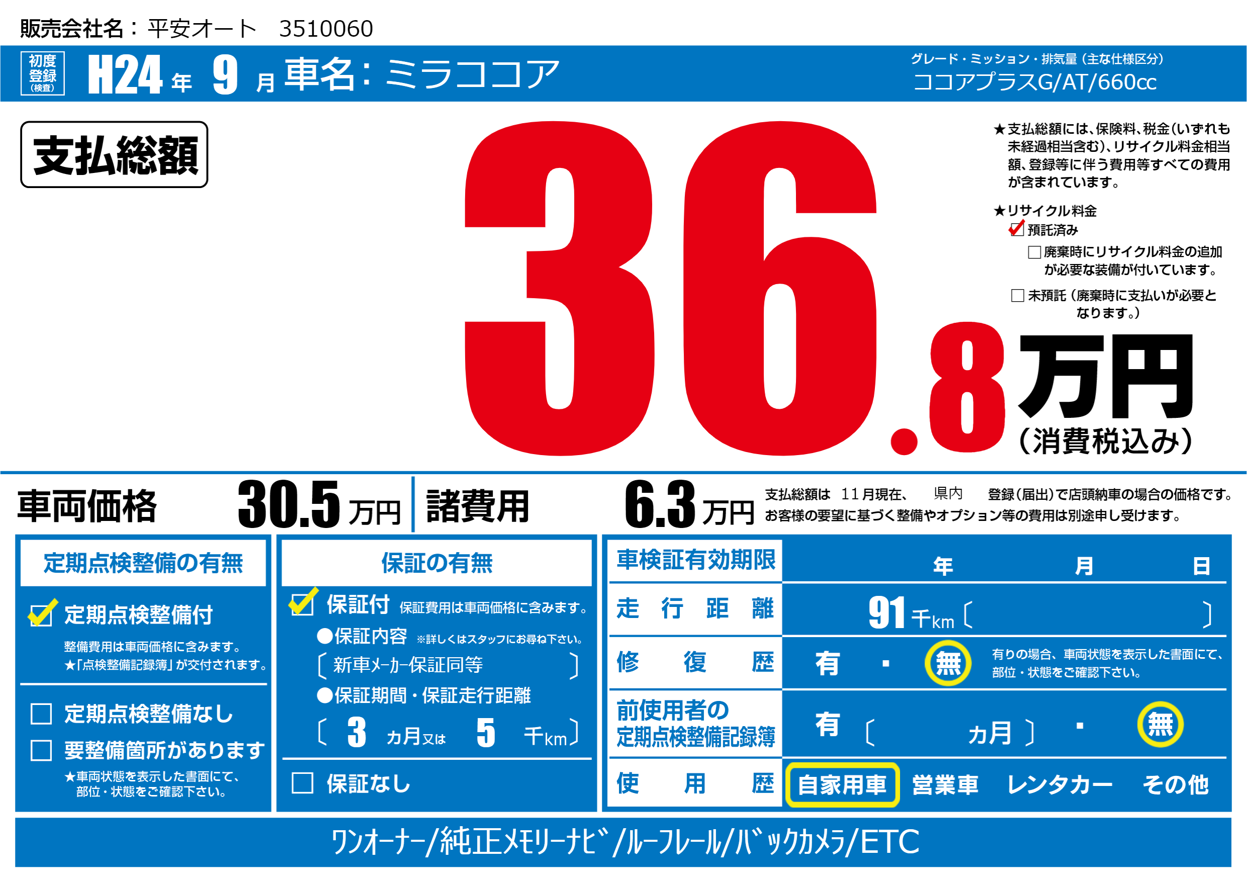 | 走行キロ | 9.1万km | 初年度登録 | H24年9月 |