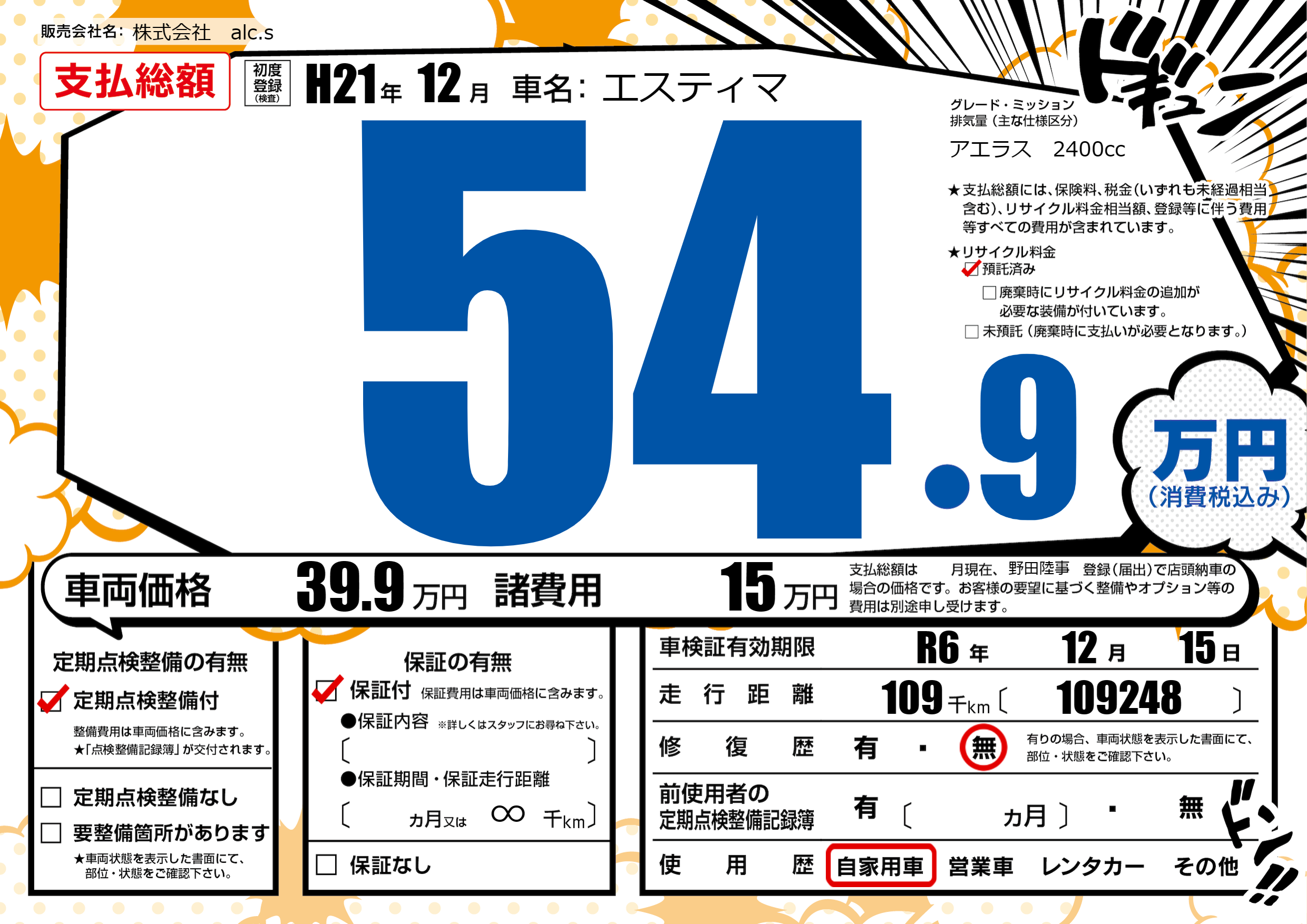 | 走行キロ | 10.9万km | 初年度登録 | H21年12月 |