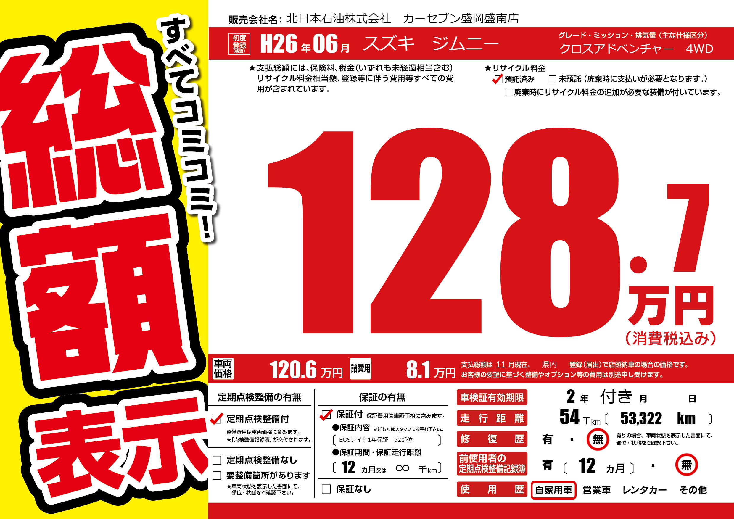 | 走行キロ | 5.4万km | 初年度登録 | H26年06月 |