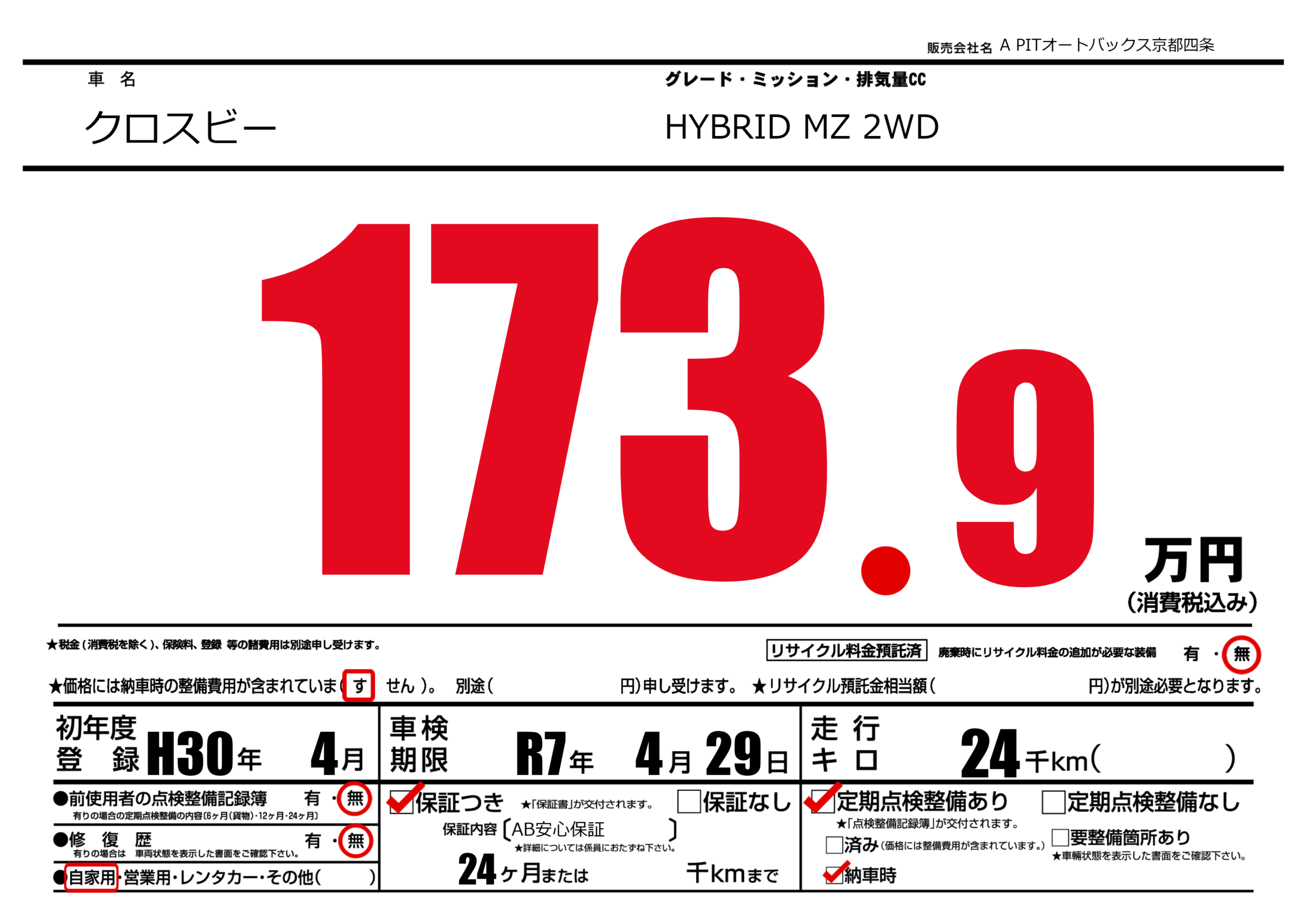 保証なし 保証内容(AB安心保証) 24ヶ月または()千kmまで |