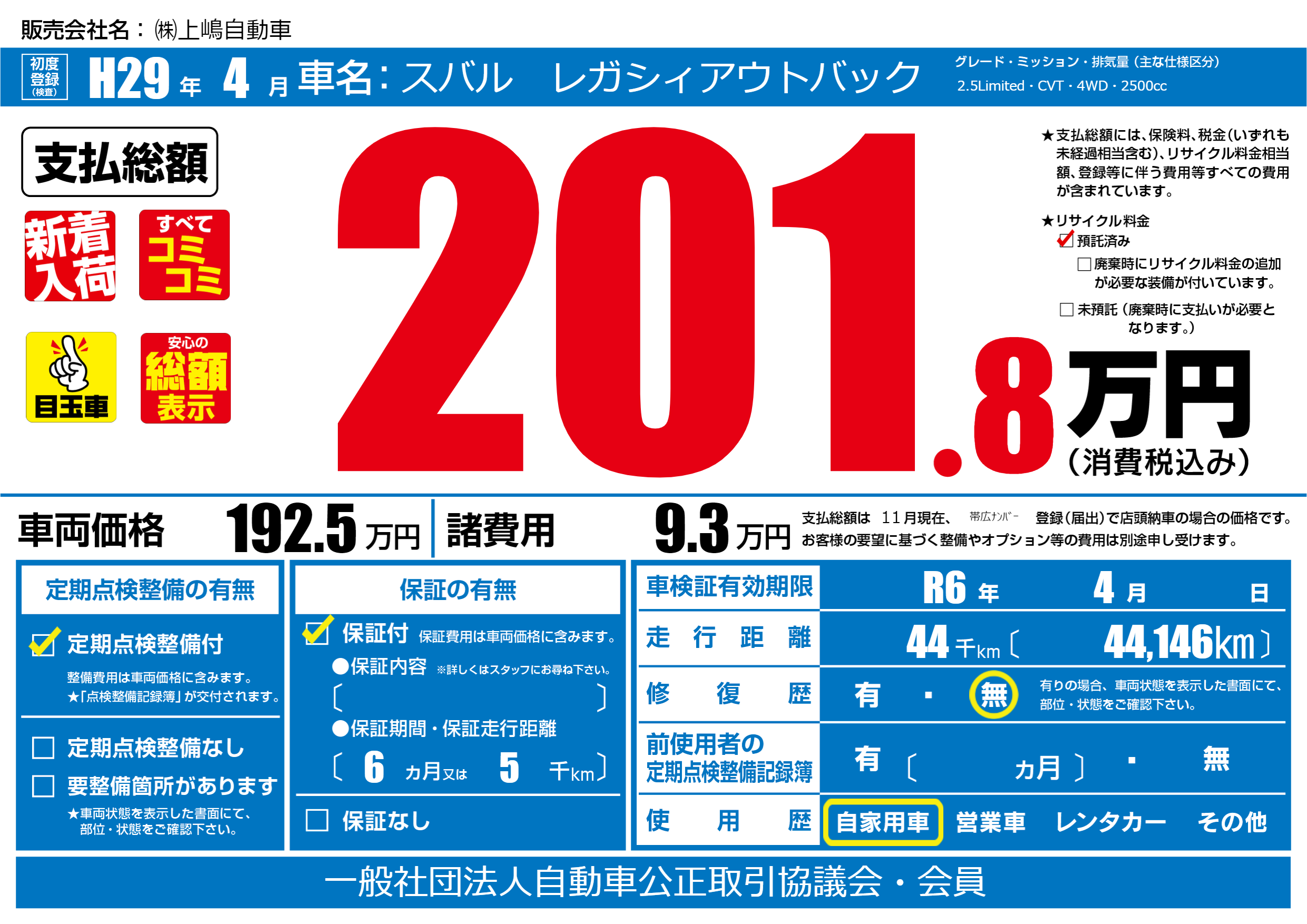 | 車名 | スバル レガシィアウトバック | グレード ミッション 排気量 |