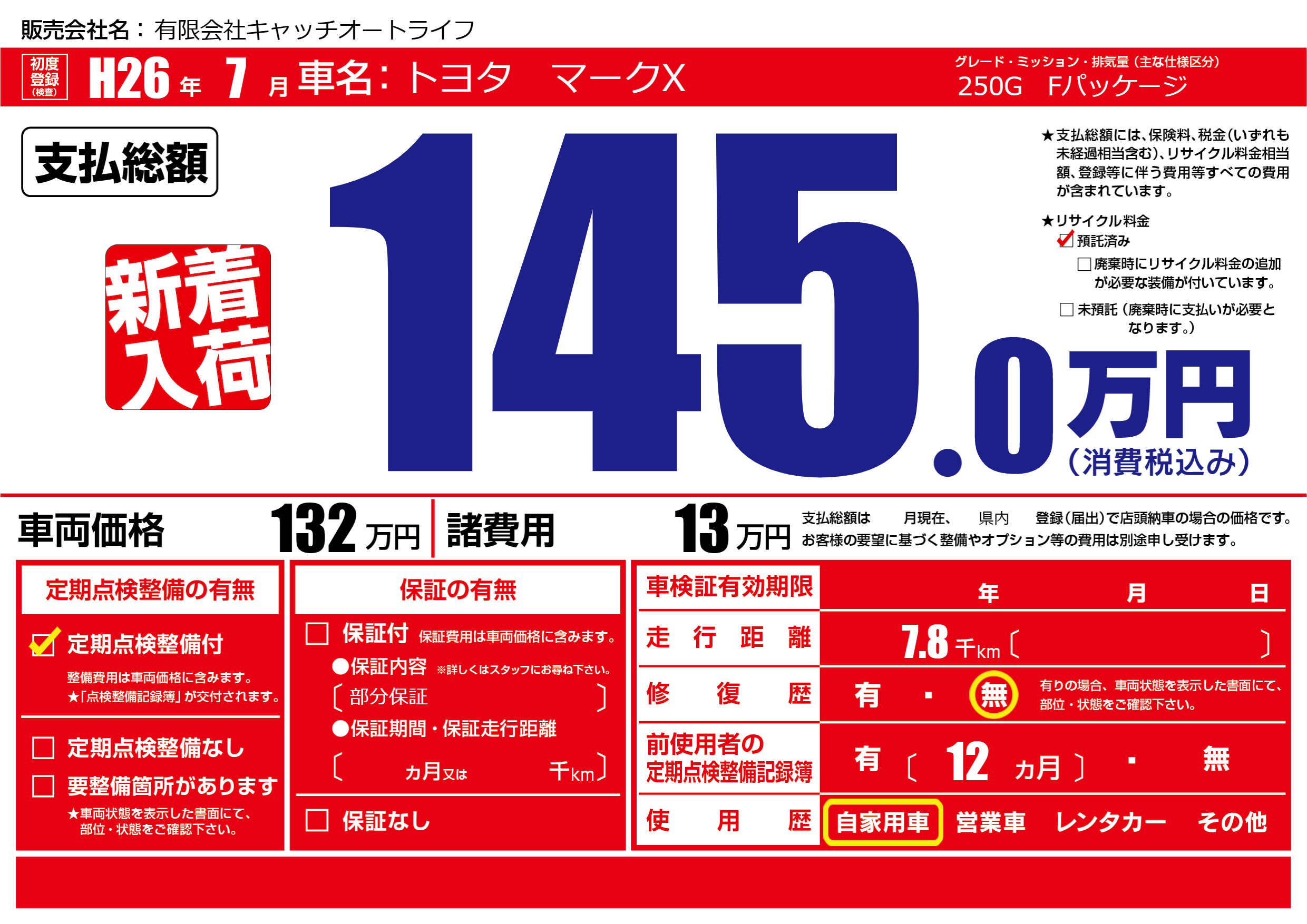 | 車名 | トヨタ マークX | グレード ミッション 排気量 |