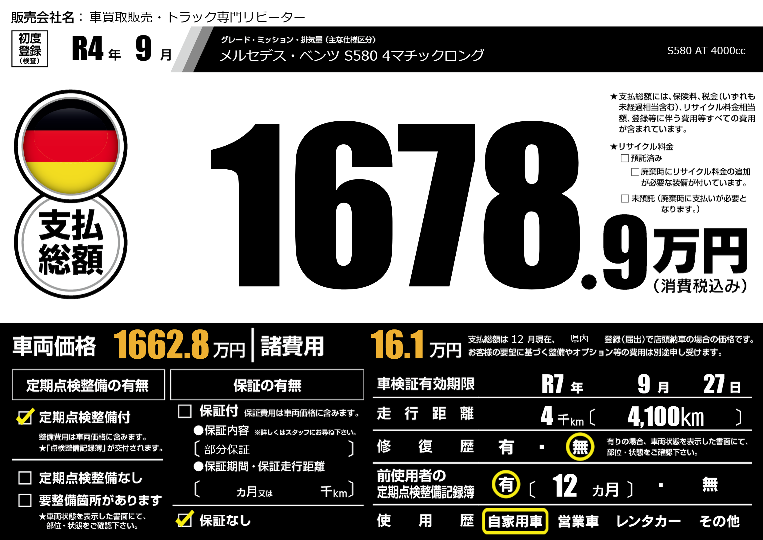 | 車名 | S580 AT 4000cc | グレード ミッション 排気量 |