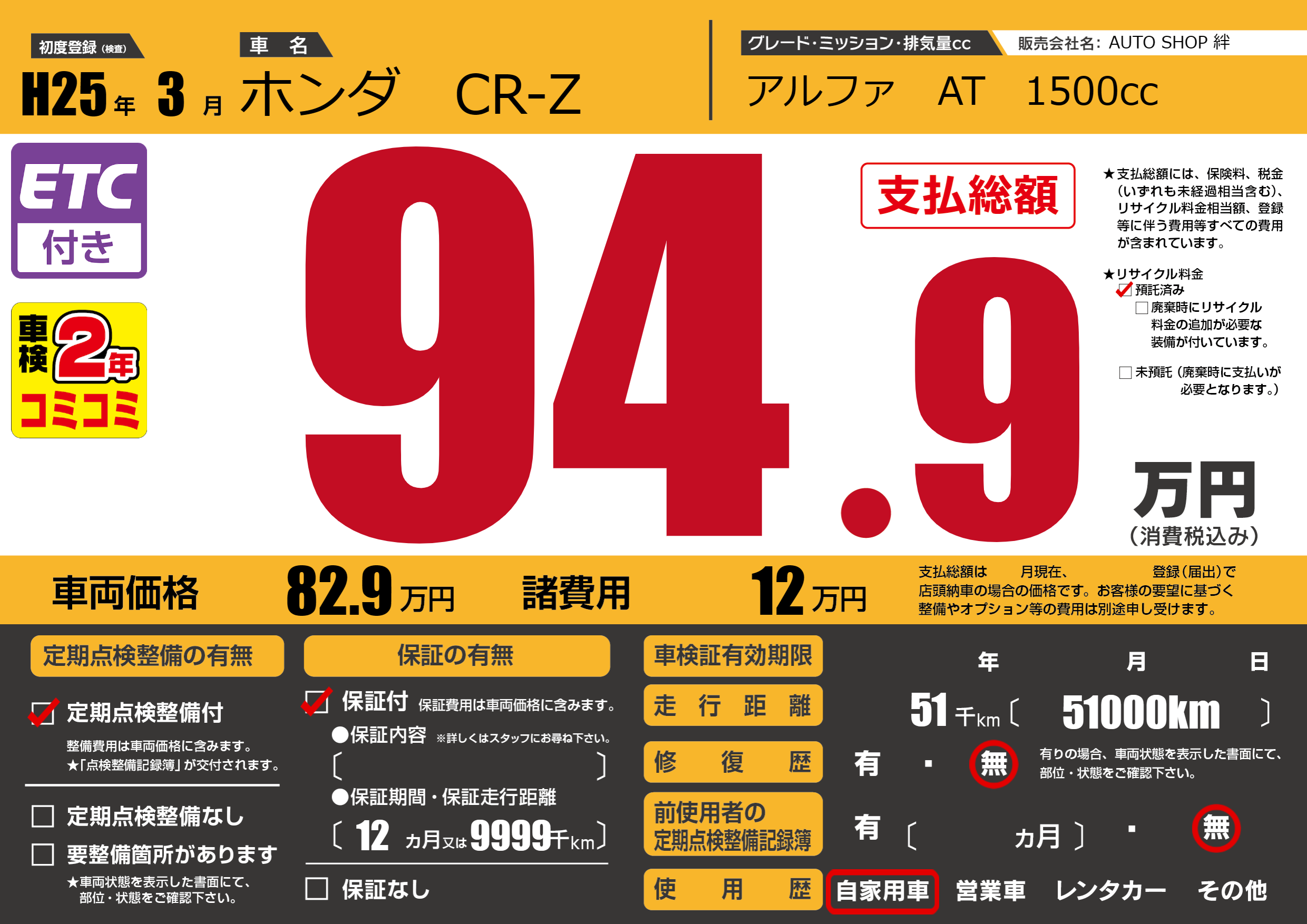 保証付き 保証内容(---) 12ヶ月または(9999)千kmまで |