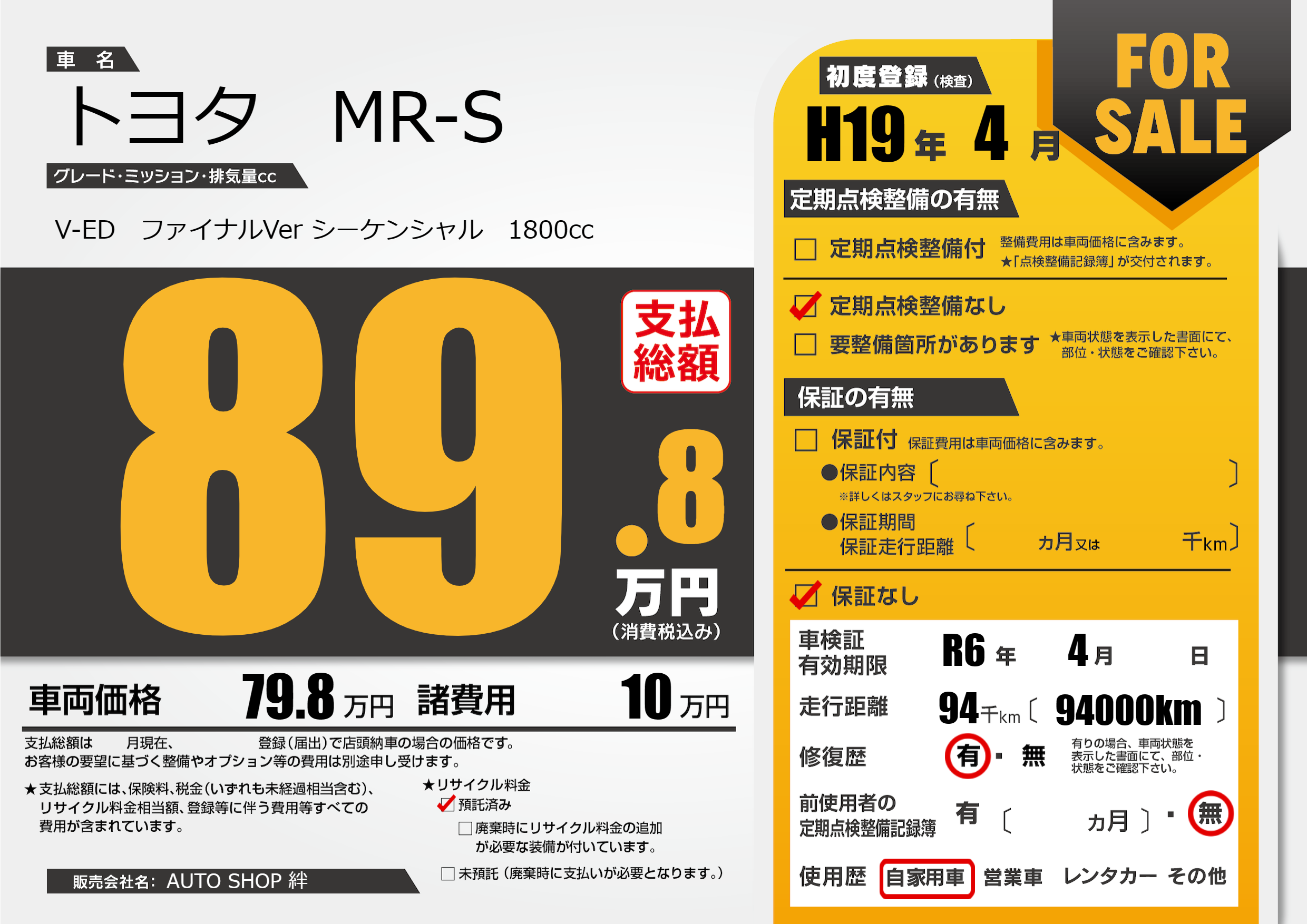 | 車検制限 | R6年 4月 - 日 | ||