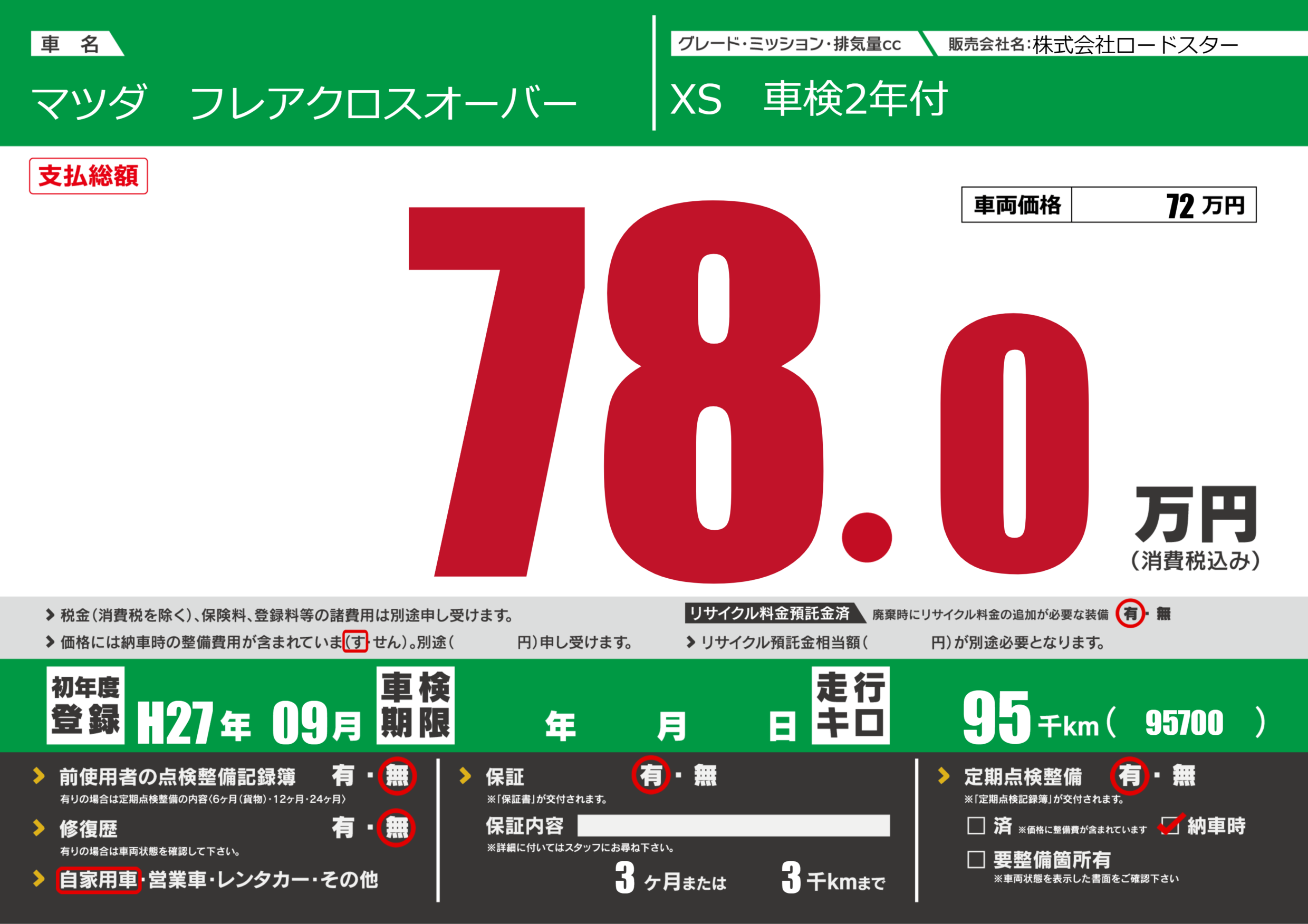 | 走行キロ | 9.5万km | 初年度登録 | H27年09月 |