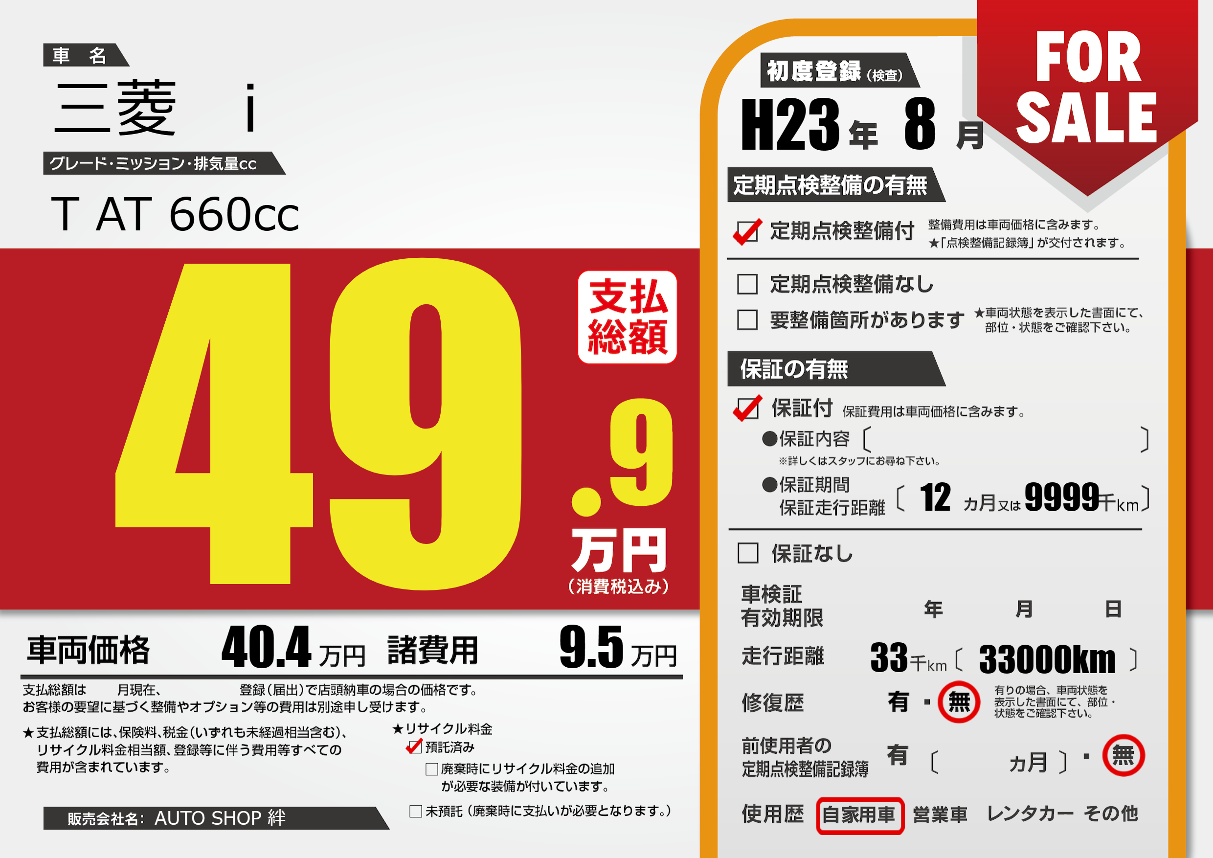保証付き 保証内容(---) 12ヶ月または(9999)千kmまで |