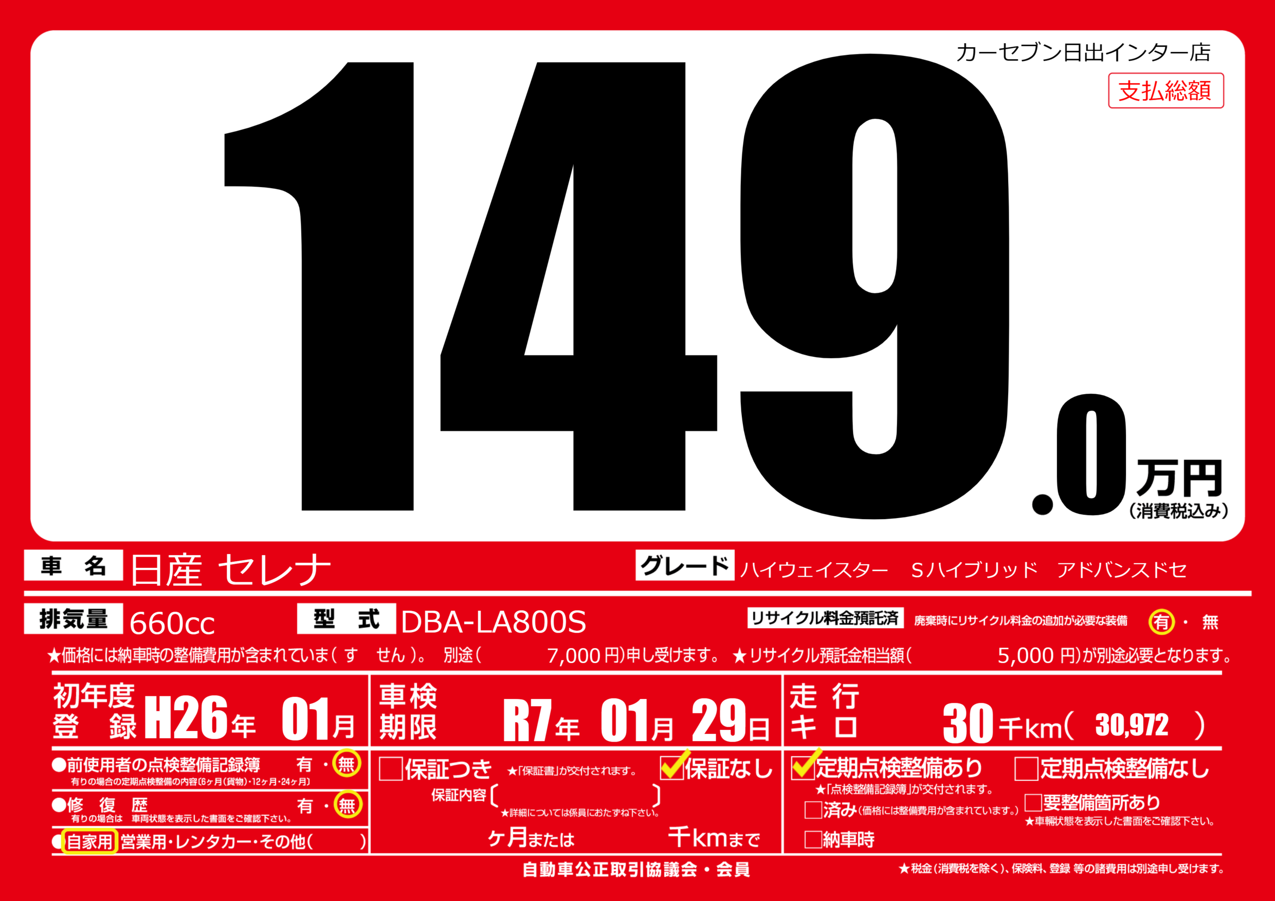 | 走行キロ | 3万km | 初年度登録 | H26年01月 |