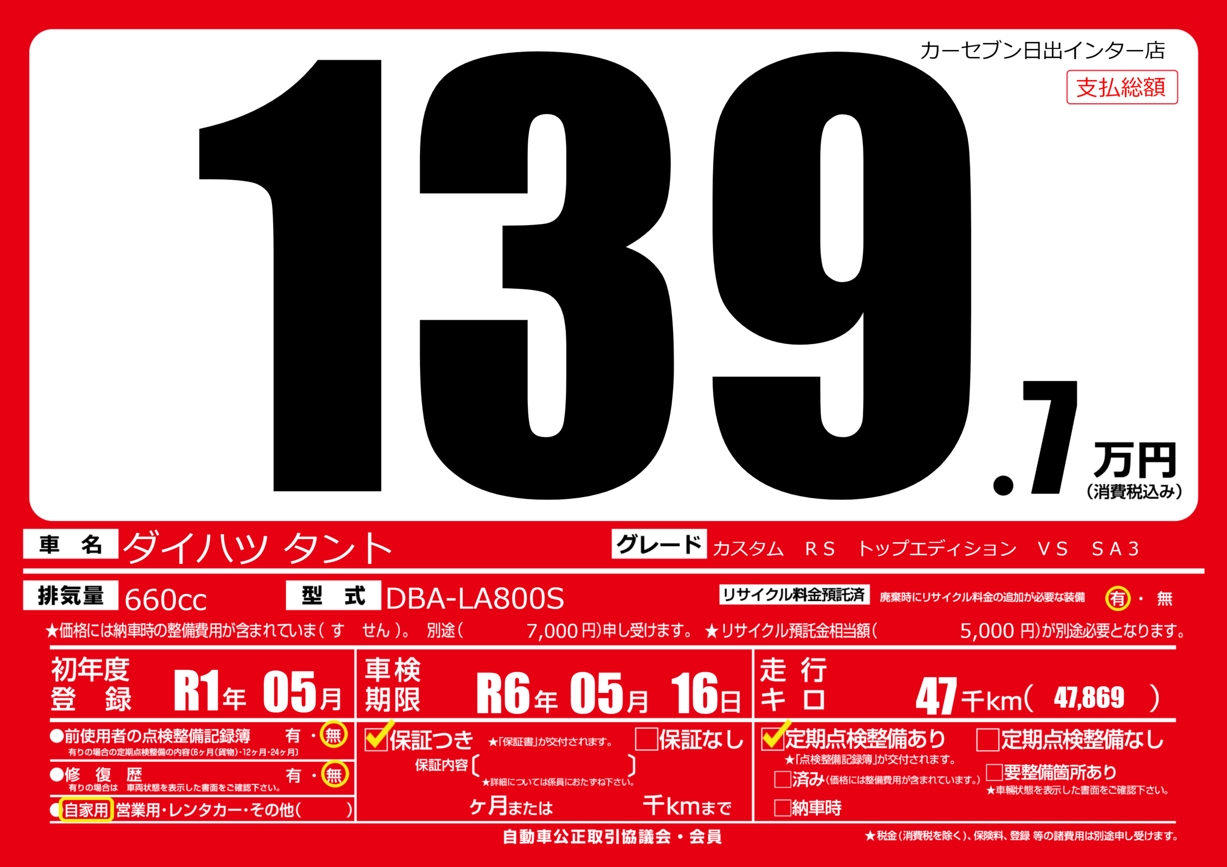 | 定期点検整備 | 定期点検整備あり | ||