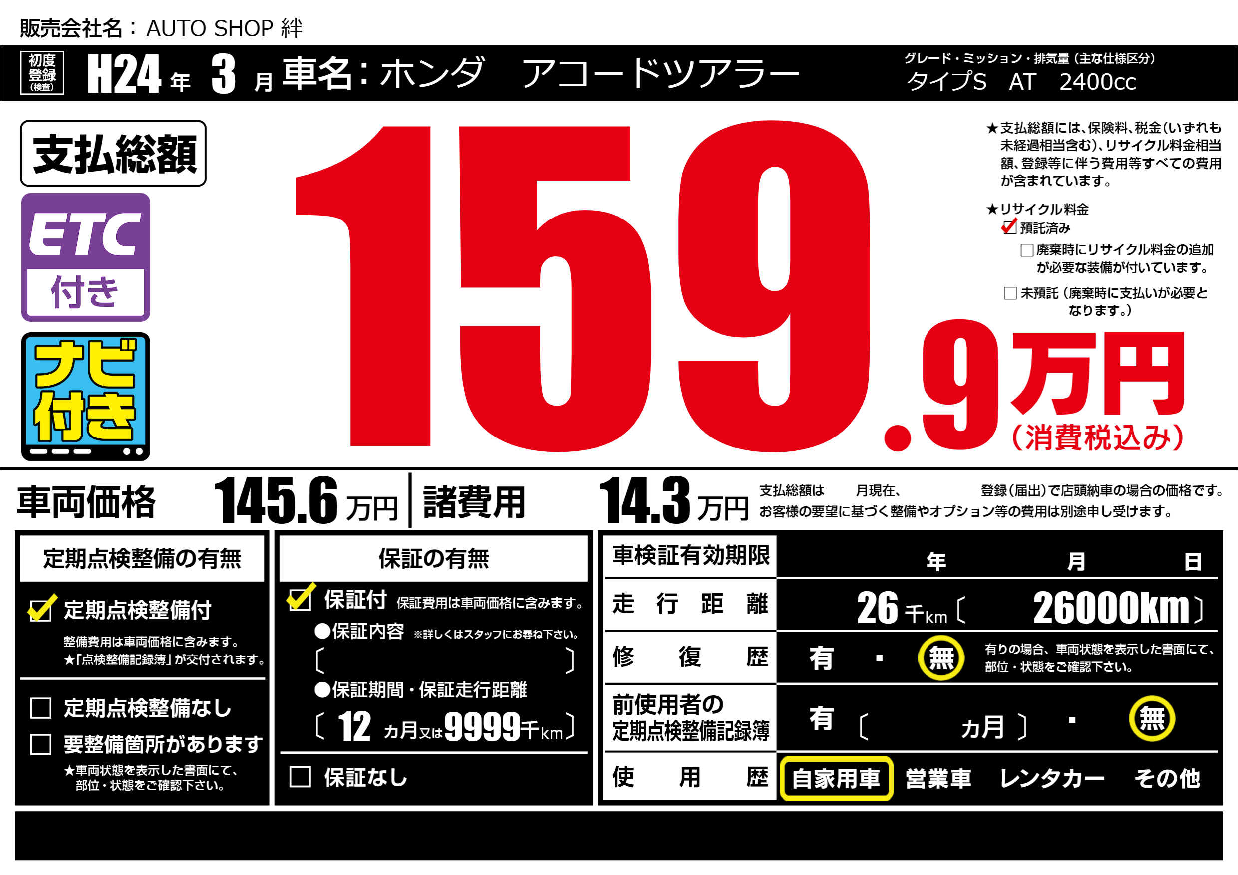 | 走行キロ | 2.6万km | 初年度登録 | H24年3月 |