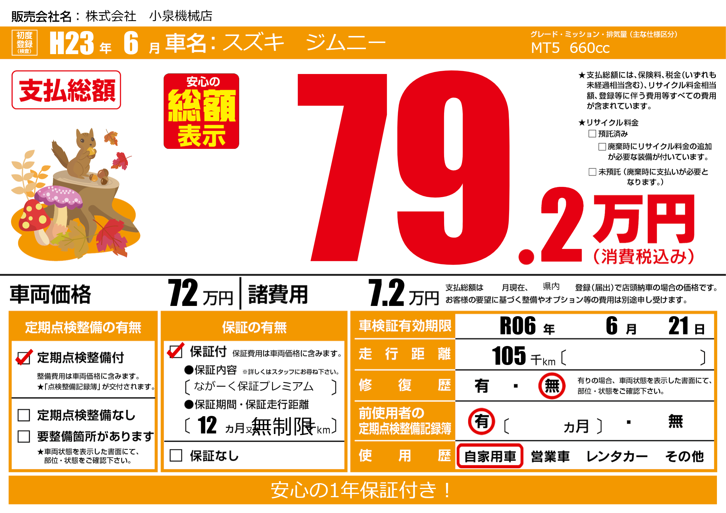 | 走行キロ | 10.5万km | 初年度登録 | H23年6月 |