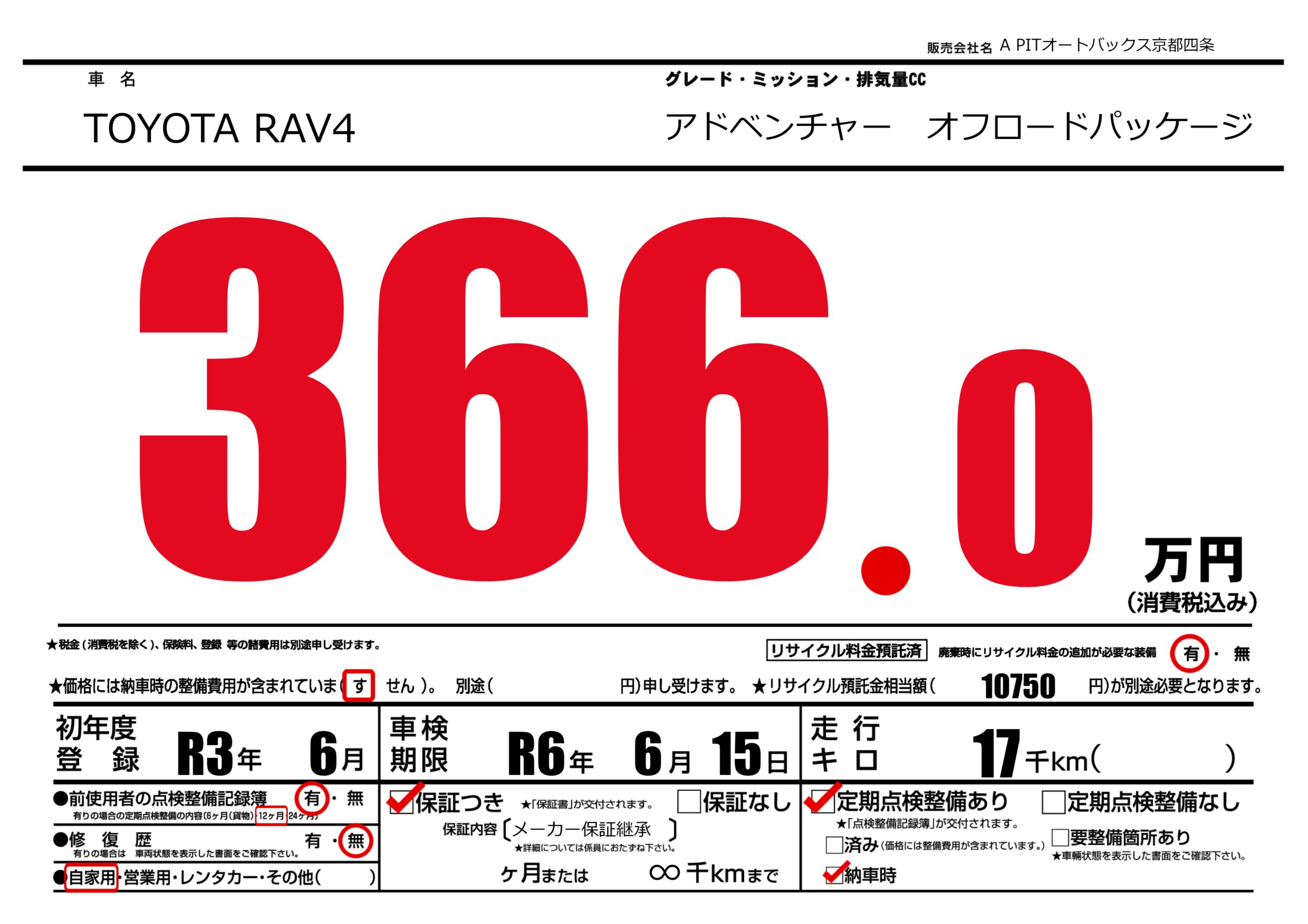 あり | 車検制限 | R6年6月15月 |