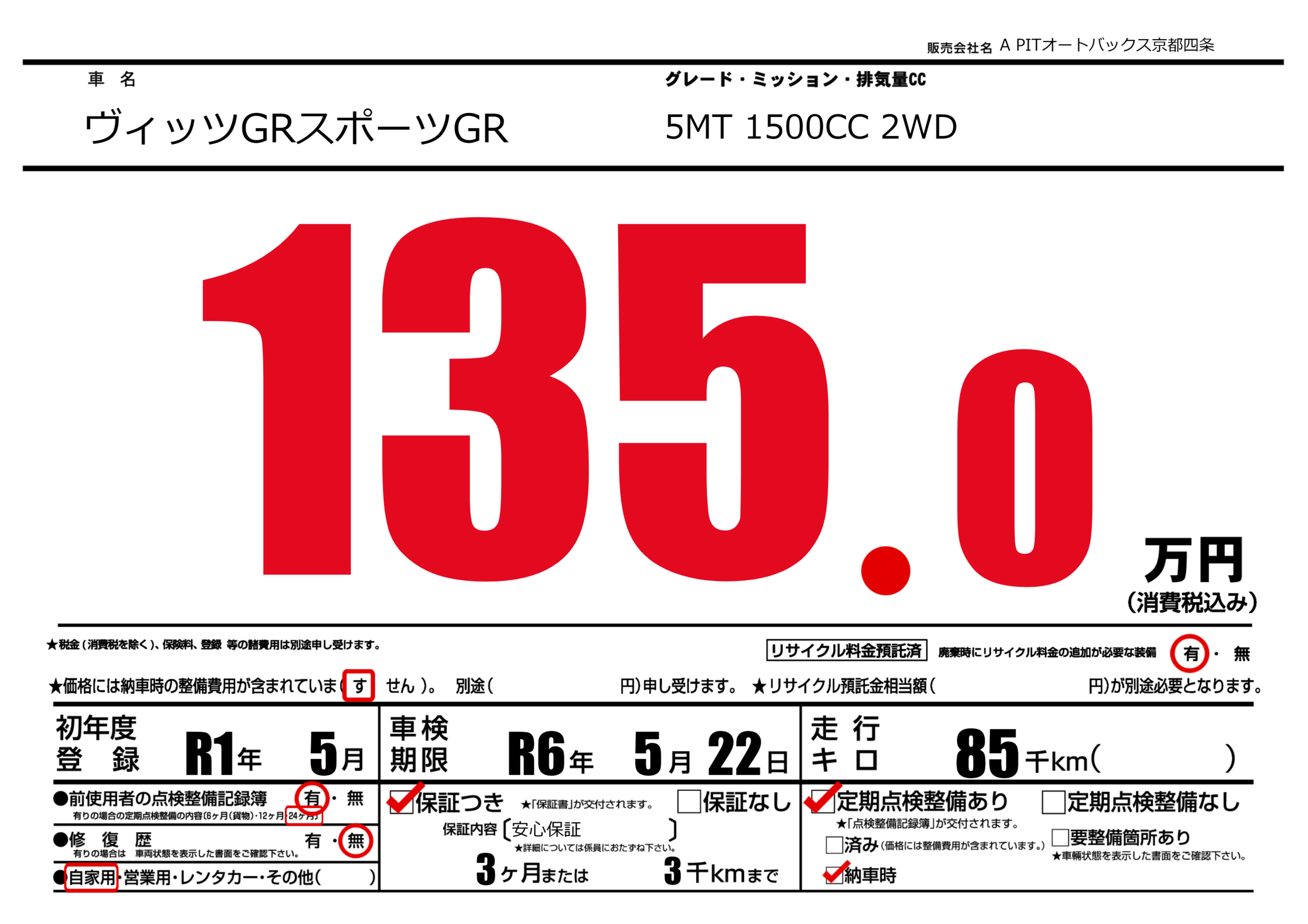 あり | 車検制限 | R6年5月22月 |